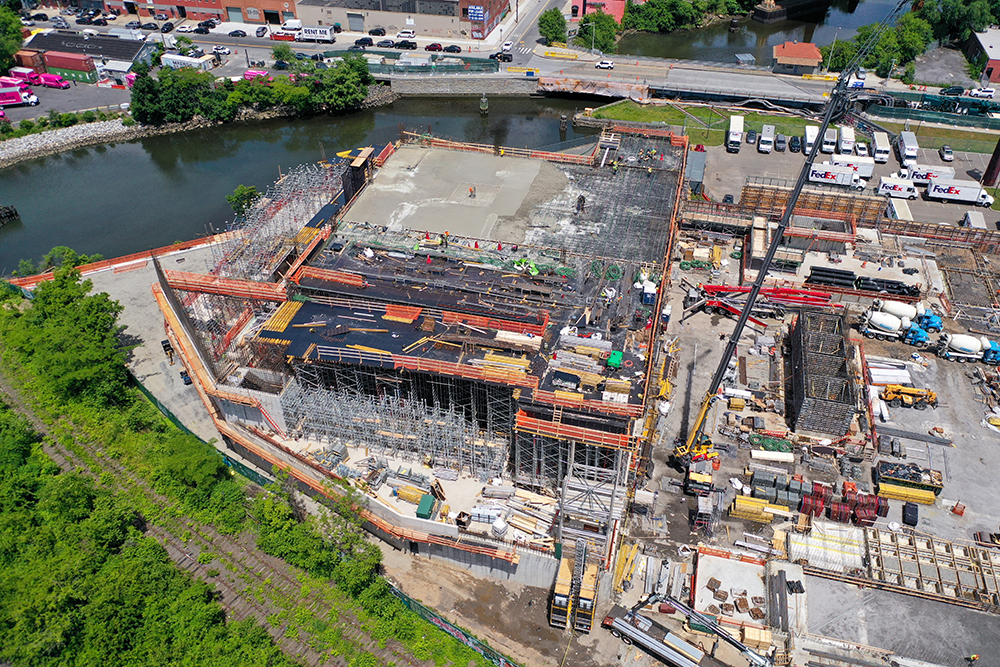 In the downtown area of Long Island City, New York lies a complex parking garage with an array of shoring materials. This 6-story concrete structure has an entry ramp and loading docks for large trucks, a cantilevered volume with red cladding, rooftop solar panels, and an open-air parking garage. In total this is a project that is about 352,000 square feet with the shortest floor being 22ft high and the tallest one being about 40ft high. ULMA is proud to be a part of this project, to provide the best possible solution for the complexity of supplying the right number of materials for the jobsite on time. By using our MEGAFRAME, MEGALITE, ENKOFLEX, ALUPROP SHORING TOWERS and RKS system we were able to assist in creating this high-level structure.