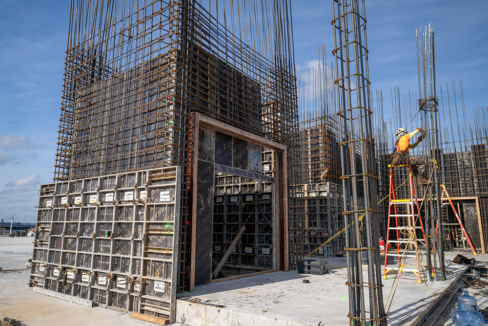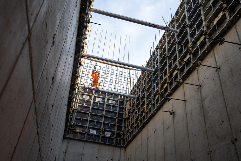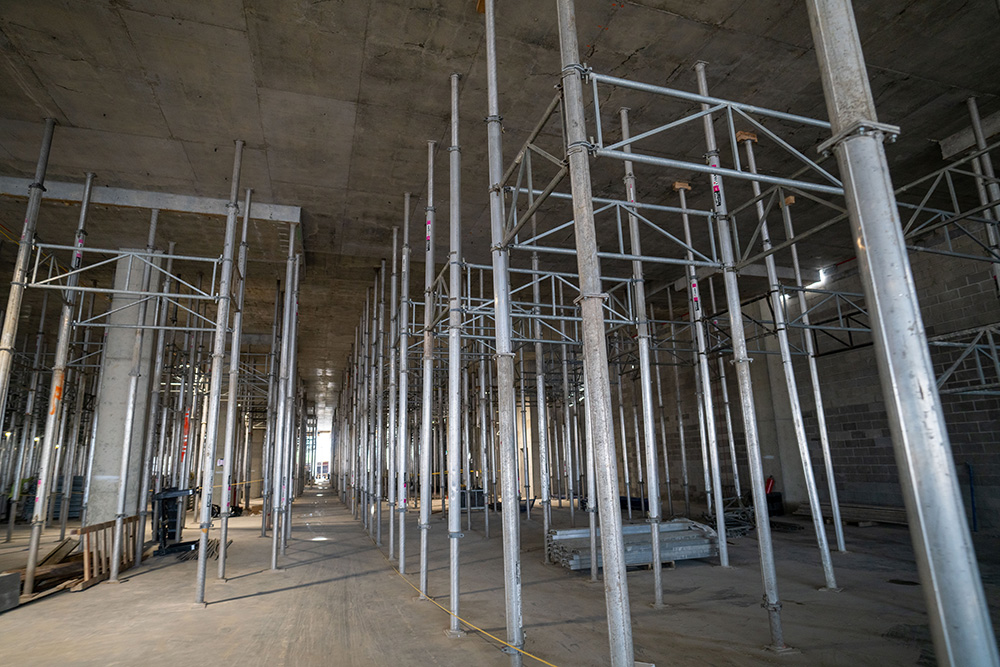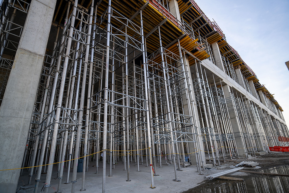 Beginning with the 4-level parking garage allowed us to use our ENKOFLEX towers and MEGAFRAME SYSTEM to support slabs and beams varying between 16” to 36” in depth. In addition to the slab support, our ALUPROP towers were incorporated into the project to support drop panels for heights up to 33’. Our ALUPROPS provided a high load-bearing capacity with a lightweight aluminum post shore supporting horizontal formwork and meeting multiple shoring and reshoring requirements. To achieve heights of 33’, our ALUPROPS were stacked and braced accordingly to accommodate the high loads required to support the structure. The core wall, shear wall, and column forming on this jobsite was supported with our MEGALITE SYSTEM in heights up to 16’.