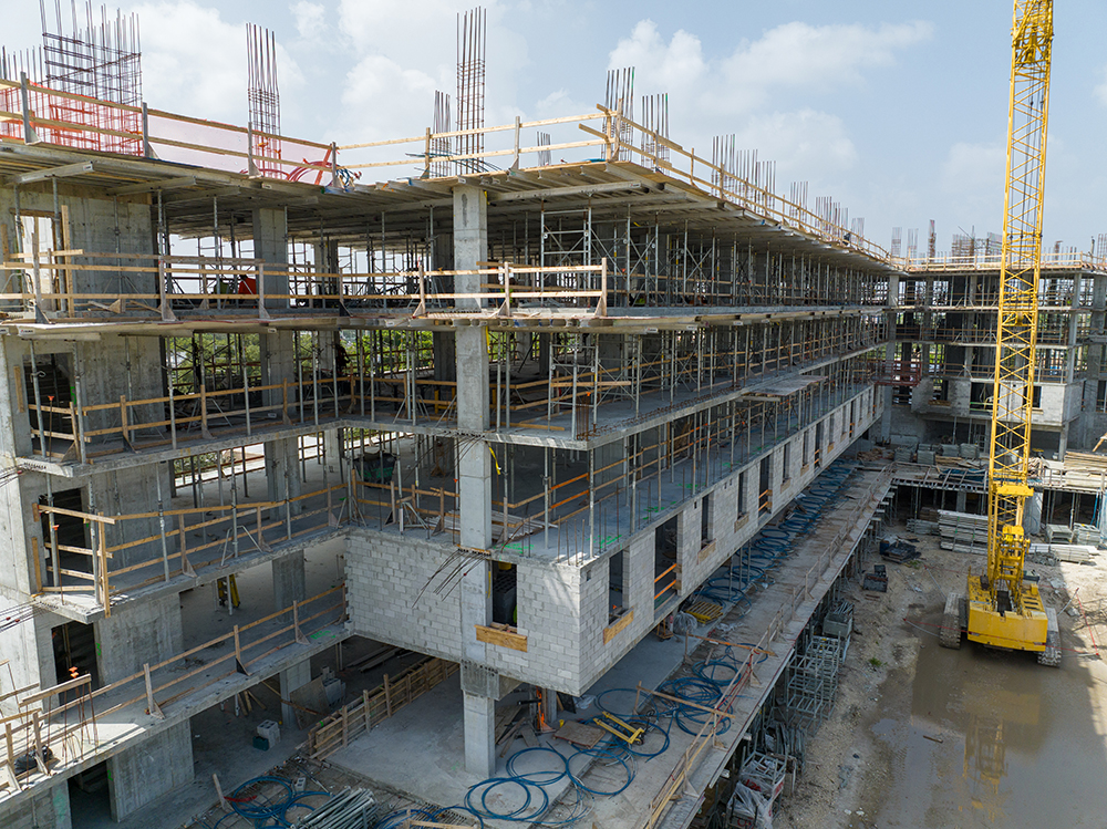For all shoring requirements we used our MEGAFRAME systems along with aluminum main beams and aluminum runners for the slabs, a stable and level surface that supports the weight of the structure. The MEGAFRAME can hold 10,000lb per leg, a steel frame handset shoring set designed to work with high floor buildings. The MEGALITE panel versatile for walls, columns and pilasters; in this project workers used the panels for the columns on each floor. One of the last products used was our MEGAFORM panels for the sheer walls, a formwork system able to be versatile for building construction and civil work.