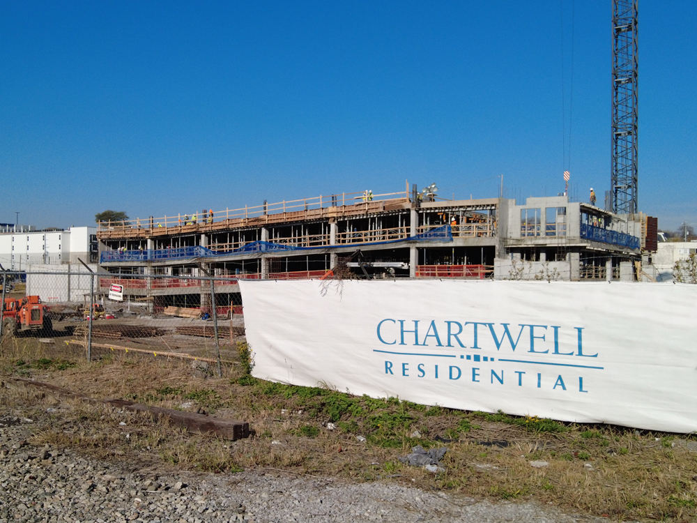 The Chartwell at Marathon Village located in Nashville, Tennessee consists of approximately 4.5 acres and is located along Interstate 40 in the Germantown neighborhood. It is part of a neighborhood improvement project in fast-growing Nashville. The project includes a 6-story parking garage wrapped by seven stories of residential units in the center of the site. The apartment buildings are 2 and 3-story concrete structures, with wood framing above. The buildings along 12th Avenue North are seven stories and step down to five stories on the western edge of the site. There is also a proposed new vehicular and pedestrian connection. A total of approximately 480 apartments, 10 townhomes and 4,000 square feet will make up this complex. The main building and parking deck total approximately 377,000 square feet (SF). The north wing 70,000 SF, the south wing totals 90,000 SF and the townhomes total 22,000 SF.