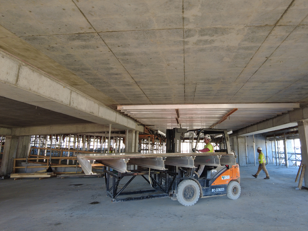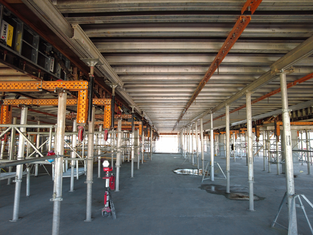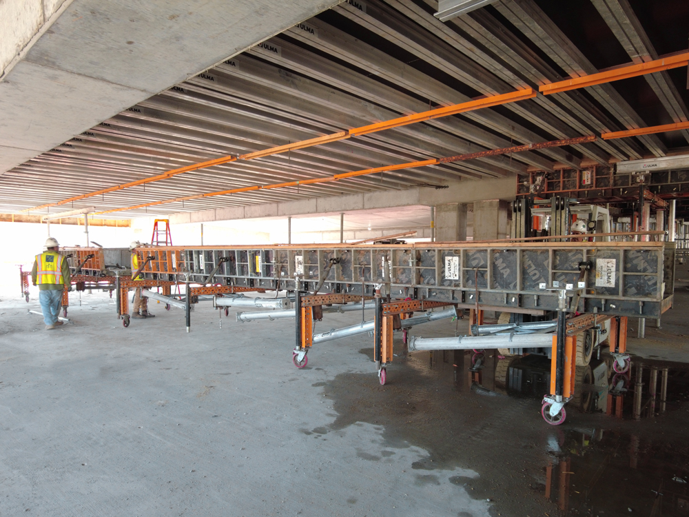 High shoring for the outlying parking deck areas were accomplished inexpensively and productively with the ULMA MEGAFRAME 10K system, with aluminum joists and stringers.