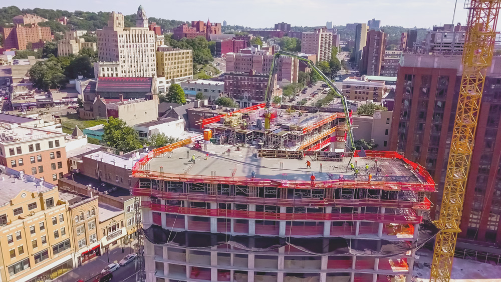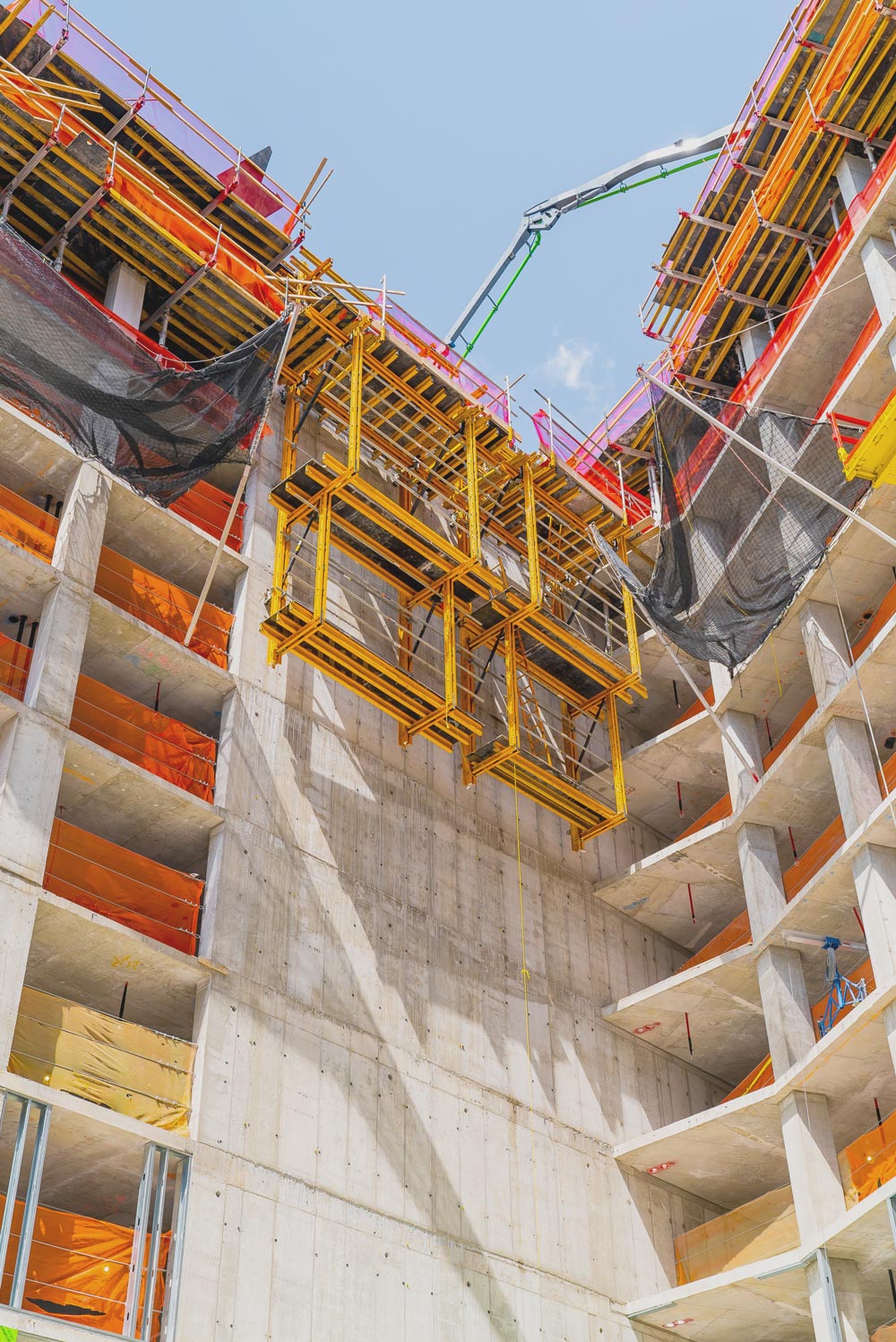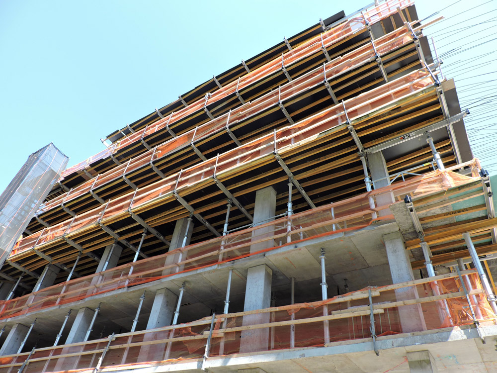 ALUPROPS, lightweight aluminum post shores were also used to shore and re-shore the 8” to 12” thick concrete slabs. ALUPROPS provide the contractor with a wide range of shoring heights; ranging from 15’ 3” for the first two levels and 9’ 2” for the subsequent 24 typical floors.
