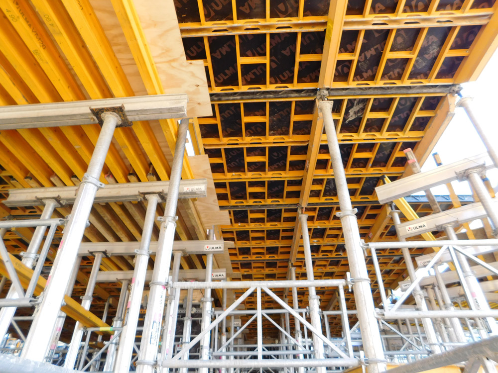 The 2,300 m² of CC-4 panels were shored with MEGAFRAME and ALUPROP galvanised aluminium towers reinforced with bracingframes. The flexibility of the MEGAFRAME falsework made it easy to adapt to the distinct load-bearing requirements of different slabs with respective heights of 9 m, 12 m, and 15 m.