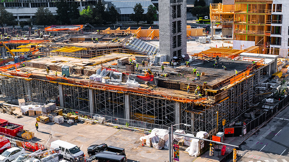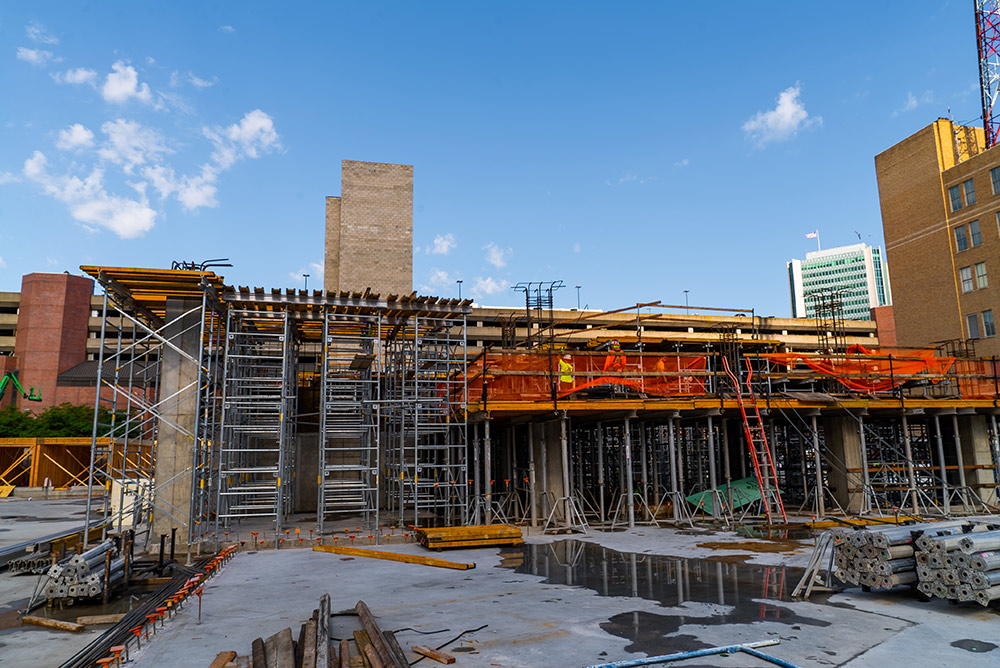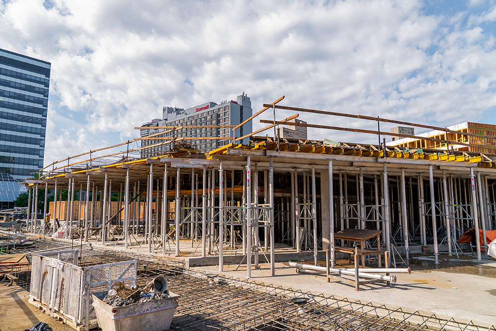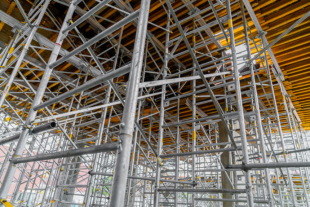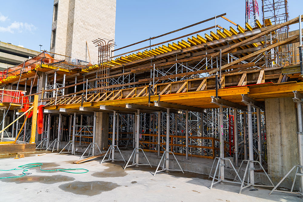 For some height slabs, ULMA proposed to use the 20K galvanized frame shoring system - MEGAFRAME. This system is designed to support high-shoring heights such as lobbies and multiple shoring heights where there are drop beams and column capitals. Over 30,000 SQF of MEGAFRAME was used on this project.