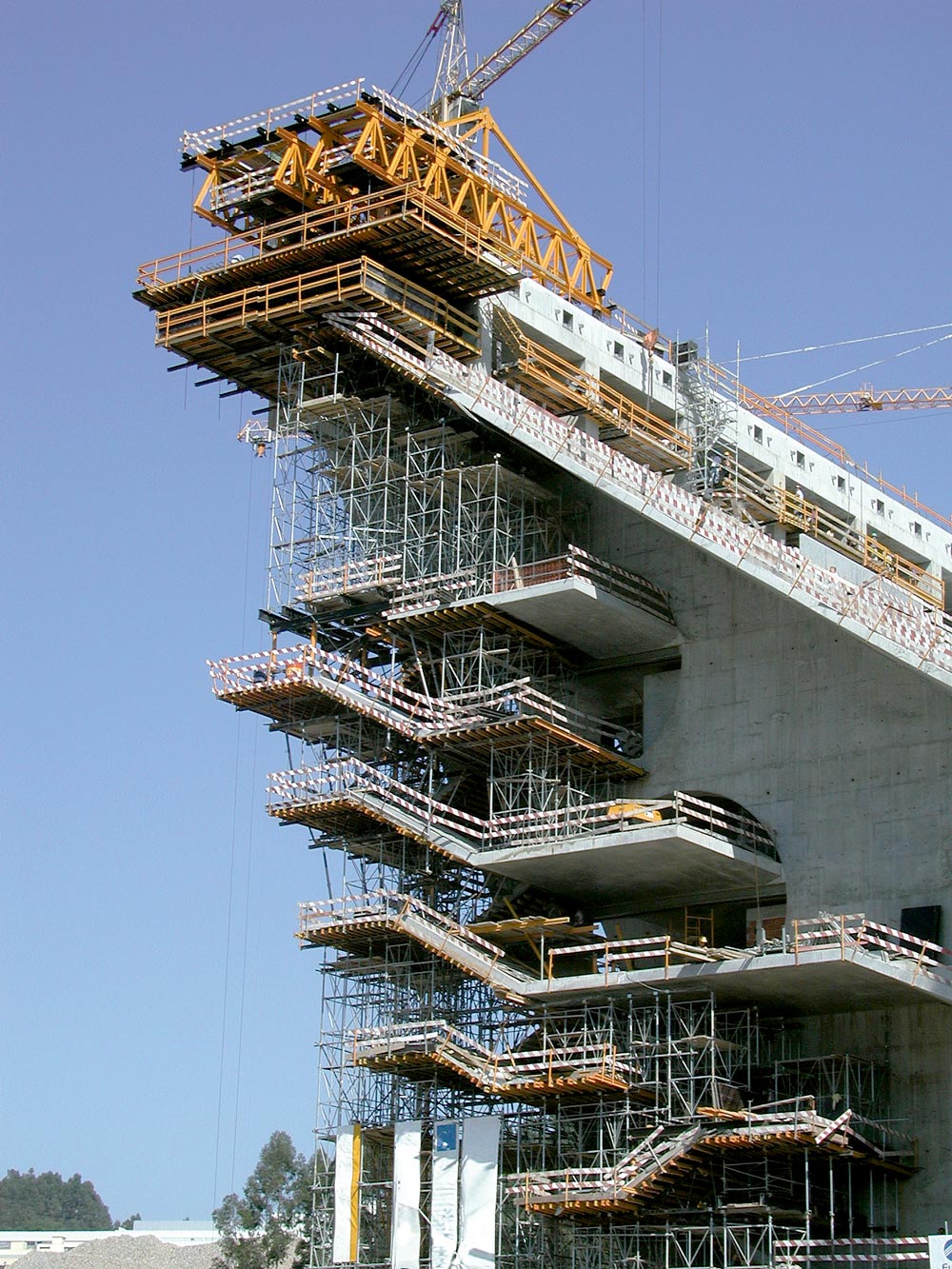 With a height of 50 m, a width of 1 m, and a distance between axes of 7.5 m, 16 walls were set up to support the stand slab and as a system to join the stadium roof. These walls were executed with ENKOFORMV-100 and Conventional Climbing Systems, in 5 m pourings. In areas with transversal lightening, the panels were supported on shoring towers.