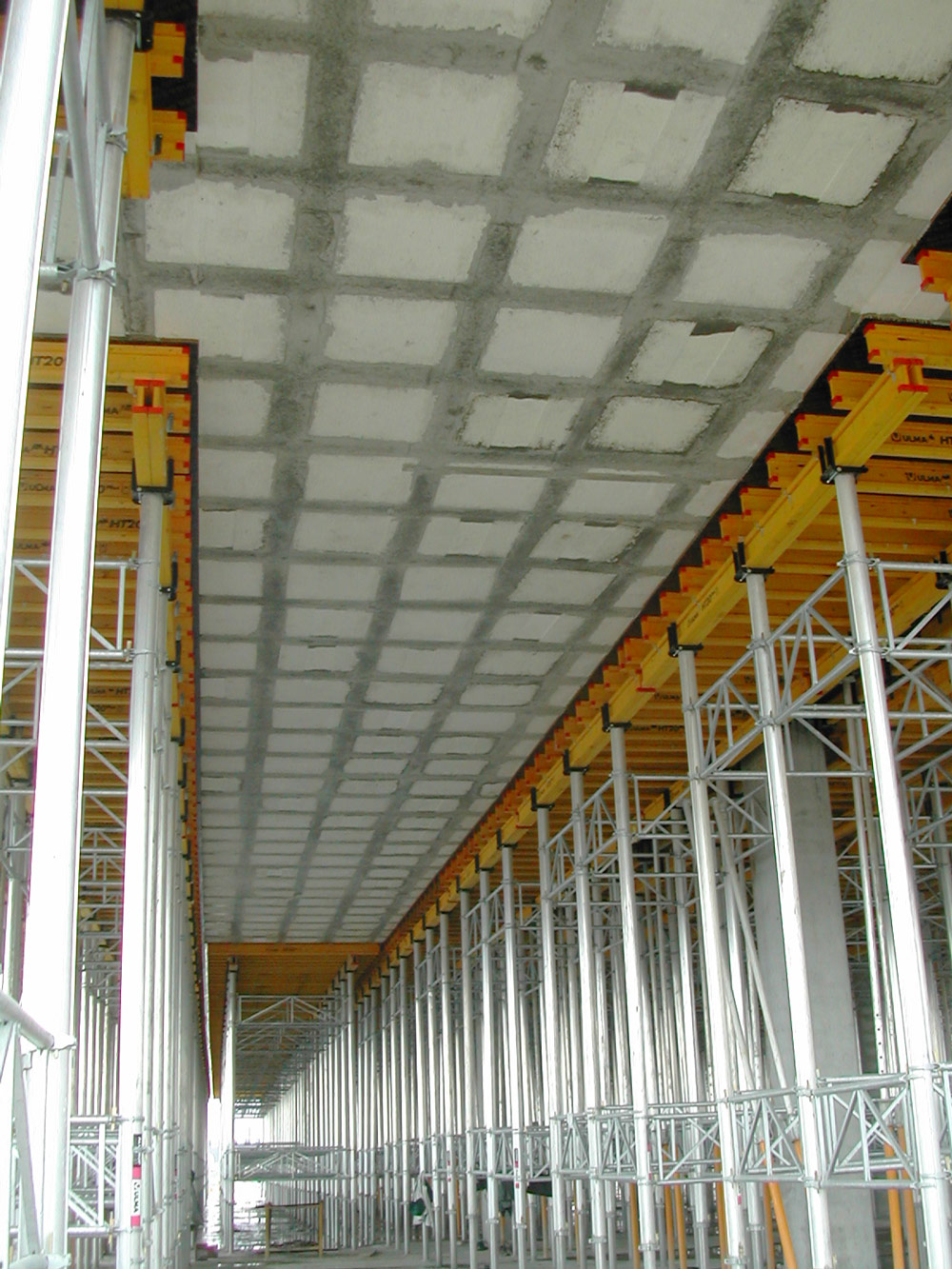 The building has two stories constructed in concrete and a third story made of metal structure. The first floor is concrete joist slab of 82x82 temporary block, 14 rib and a thickness of 40+7 with a free height of 4 m and a surface area of 120,000 m2, while the top floor is a voided slab with lights up to 16 m, 58+7 wide, and free heights: 5.78 m and 7.93 m and a total surface area of 85,000 m2.