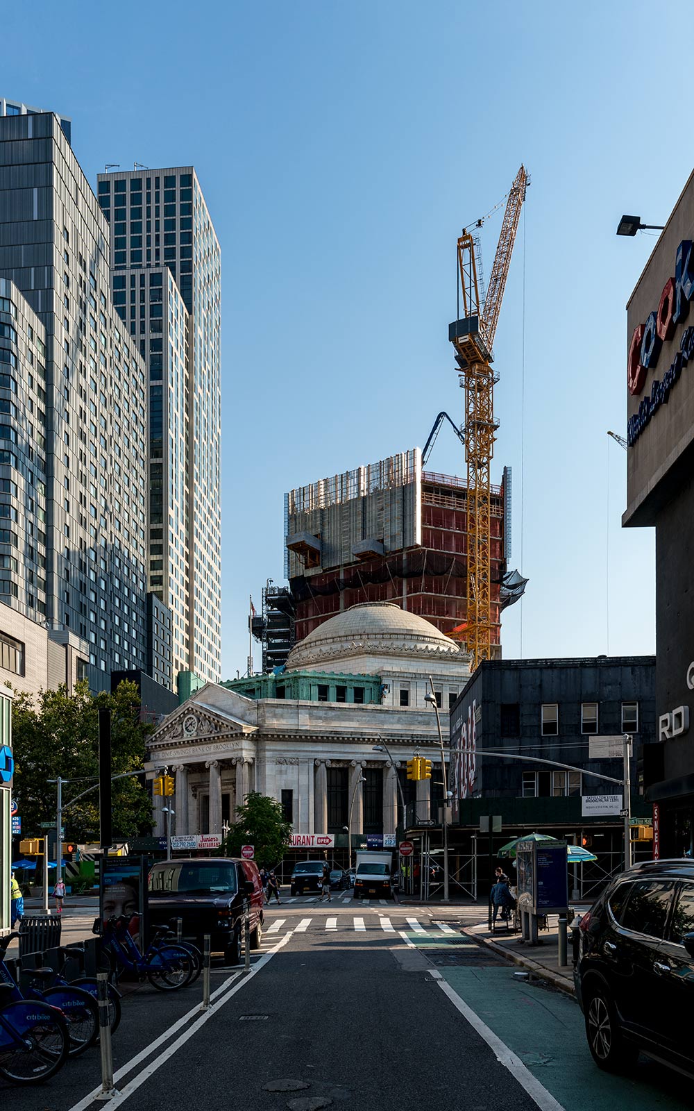 The supertall edifice will join the landmarked Dime Savings Bank, a historical and monumental building founded in 1859 which will be restored to connect pedestrians between Flatbush Avenue and Fulton Street. 9 Dekalb Avenue will add a glamorous look to Downtown-Brooklyn due to the use of marble and bronze as the primary materials of the construction.
