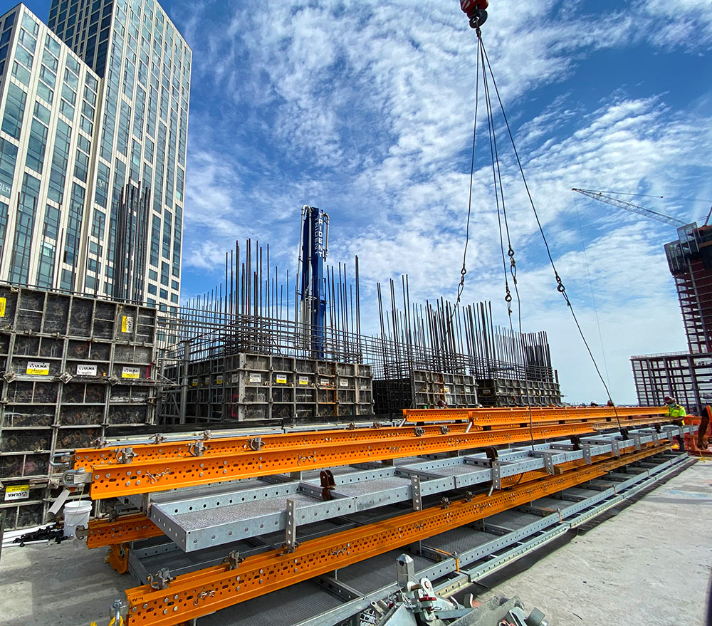 ULMA’s lightweight handset panel MEGALITE is currently being used to erect the walls and columns of the tower. This product supports a concrete pressure of 1,250 psf and allows the erection of walls higher than 8’. Right now, MEGALITE is present all over the base structure of the building while the first columns are being built. At the same time, our H20 beam slab formwork ENKOFLEX is used to form slabs with a thickness of 12 inches. The system is supported by ALUPROP posts. The aluminum shoring posts are the perfect solution to shore horizontal formwork. The props have a high load-bearing capacity, and they are easy and quick to adjust and enable ergonomic and safe working conditions for workers.