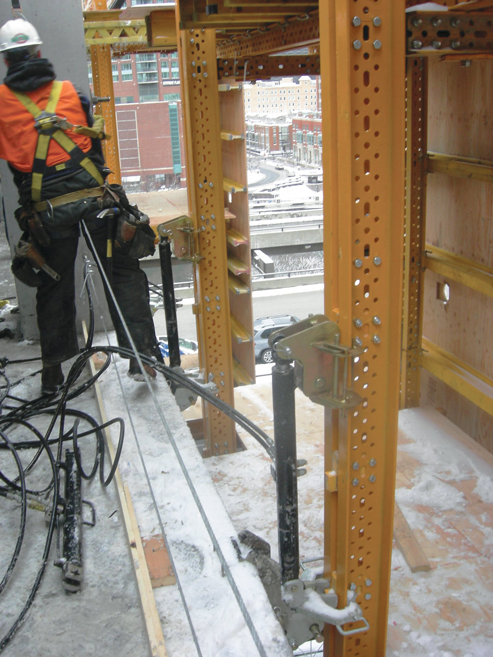 The HWS Hydraulic Windshield System prevents workers and materials from falling at height as well as providing some protection from adverse weather conditions. It is lifted with a mobile hydraulic system.