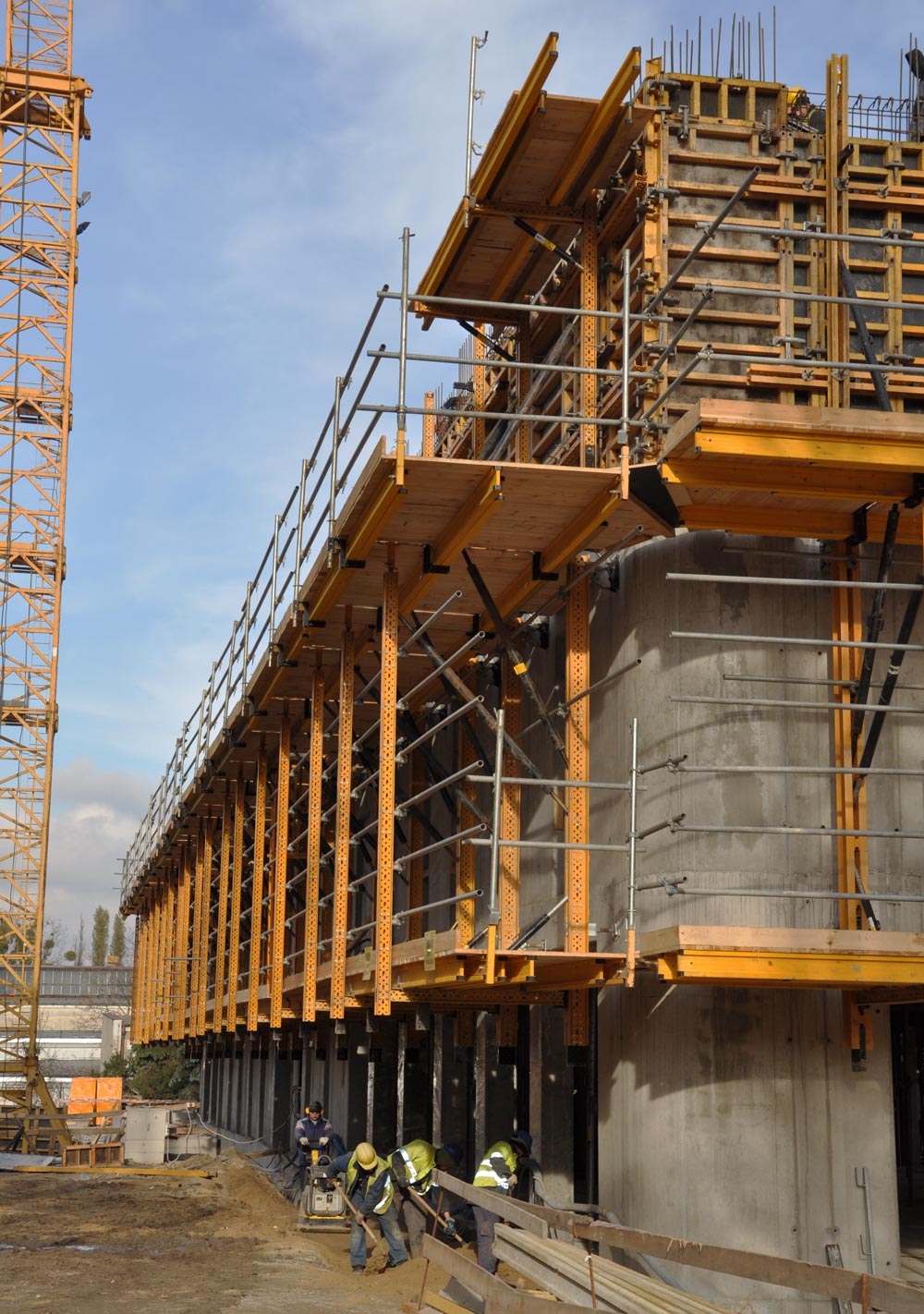 The building was built with 22 6 and 7 m wide structures, each with 4 levels of platforms: pouring platform, main platform with ORMA formwork support, cylinder control platform and cone recovery platform.