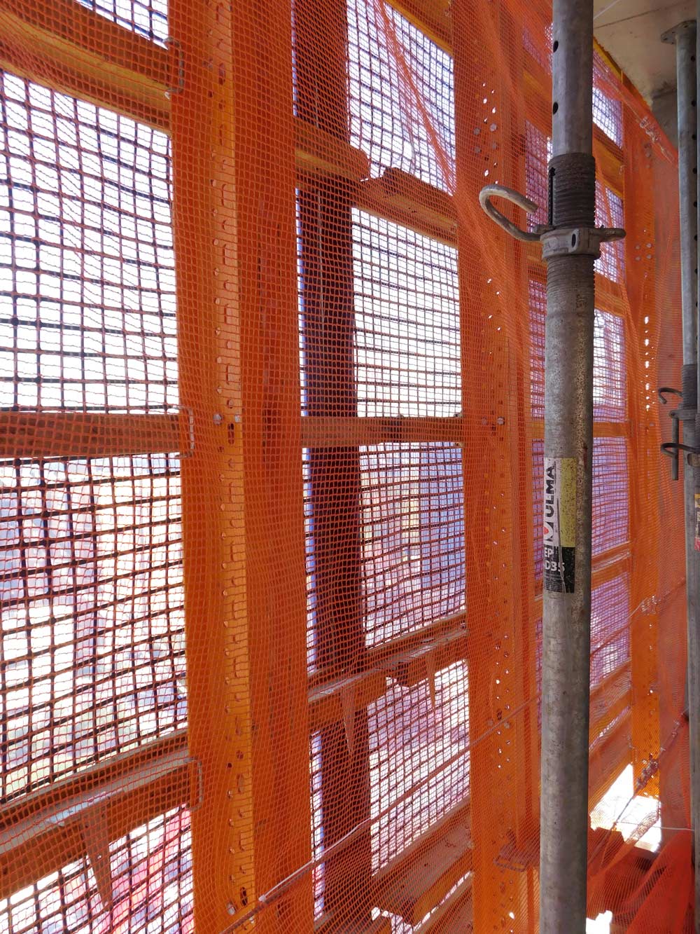This job consist on a total of 40 straight screens and 6 platforms. The screens compromised a surface area of approximately 22,000 ft2. In two locations of the building, two platforms were installed next to each other to provide a larger surface area and more loading capacity for easy transport of equipment. The screens used for this solution were 45 ft. high and 12 ft. wide, made with horizontal H20 beams and reinforced netting which provides an aesthetic finish with minimal weight, and stress on the anchors.