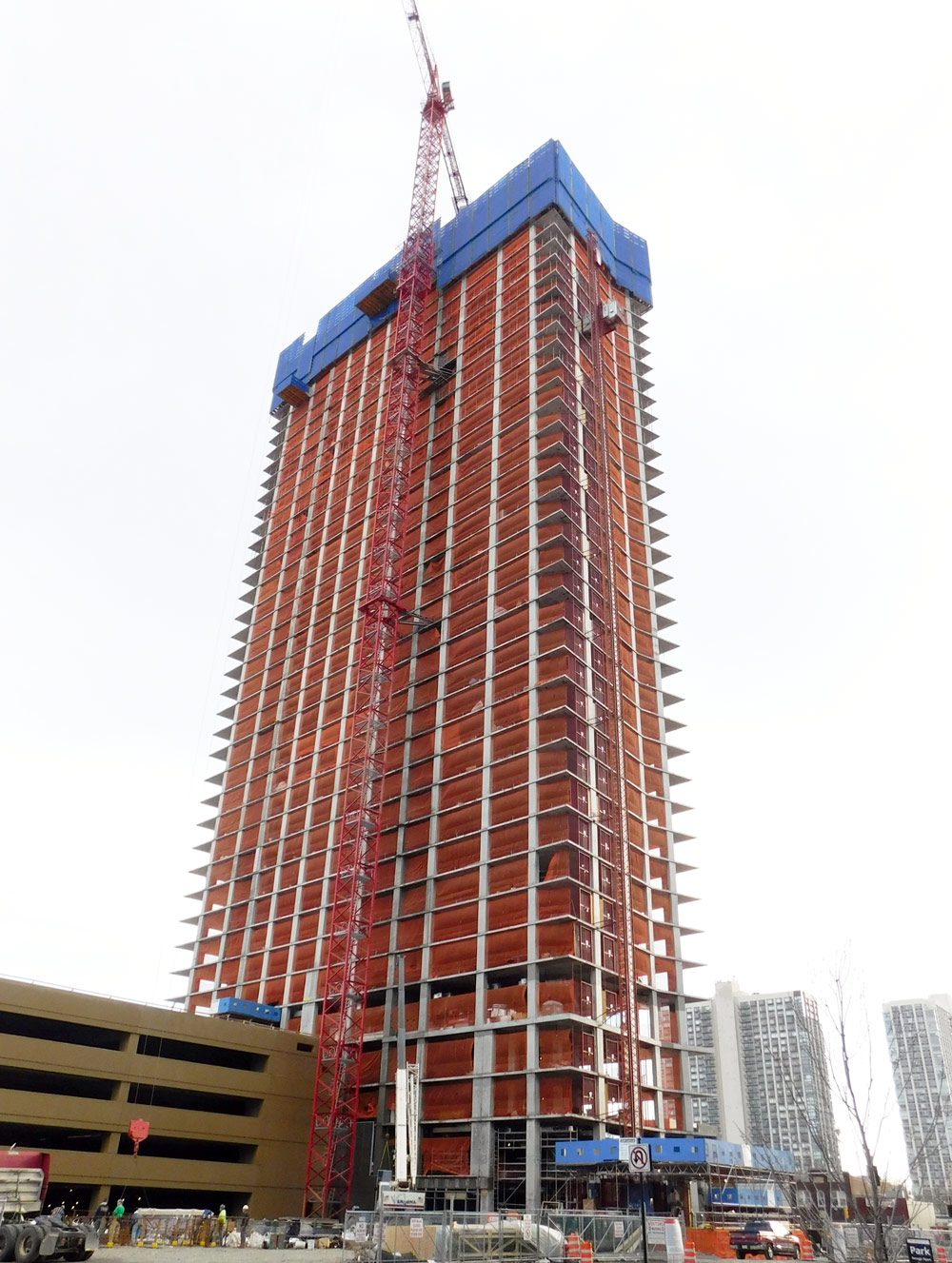 Another ULMA system used in this project included MEGAFRAME, our 10,000 pound per leg (20,000 pound per frame) galvanized steel frame handset shoring system used for the 20 ft. high lobby level.