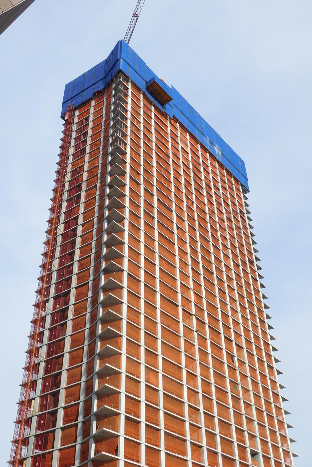 ULMA proposed the use of HWS “Hydraulic Windscreen System”; a safety system for the perimeter of mid-rise and high-rise buildings. It covers the floor under construction and the floors immediately below preventing workers, material, and equipment from falling off working areas as well as providing some protection from adverse weather conditions. ULMA’s HWS system is lifted with a mobile hydraulic system and it is based on ULMA’s MK system, providing great versatility when configuring different types of structures, easily adapting to any geometry; while reducing crane time requirements.