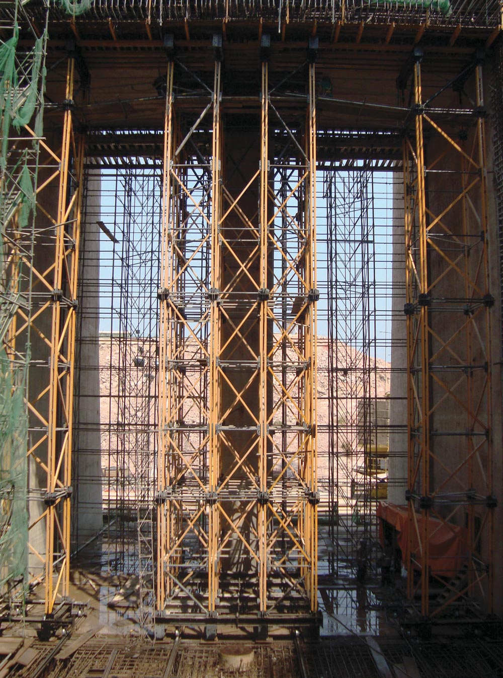 To cope with the dimensions of the water intakes (18 m high and 2.5 m thick), a solution with two mobile MK-360 Shoring towers and ENKOFORM HMK and VMK formwork was designed. Erection and dismantling tasks were considerably quicker with a form carrier with rolling system moved forward from stage to stage.