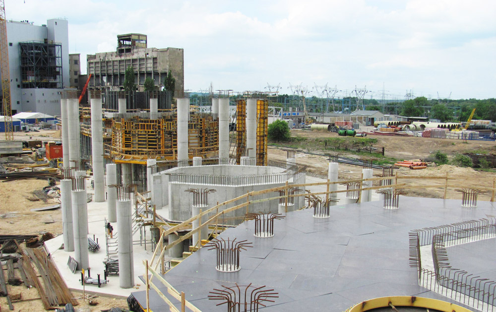 For biomass storage, eight reinforced concrete silos with a capacity of 8,000, 6,000 and 1,000 m3 were erected. The 30 cm thick tank walls have inside radio between 9 and 22 m with heights of 13 to 19 m. The steel roof reaches 35 m.
