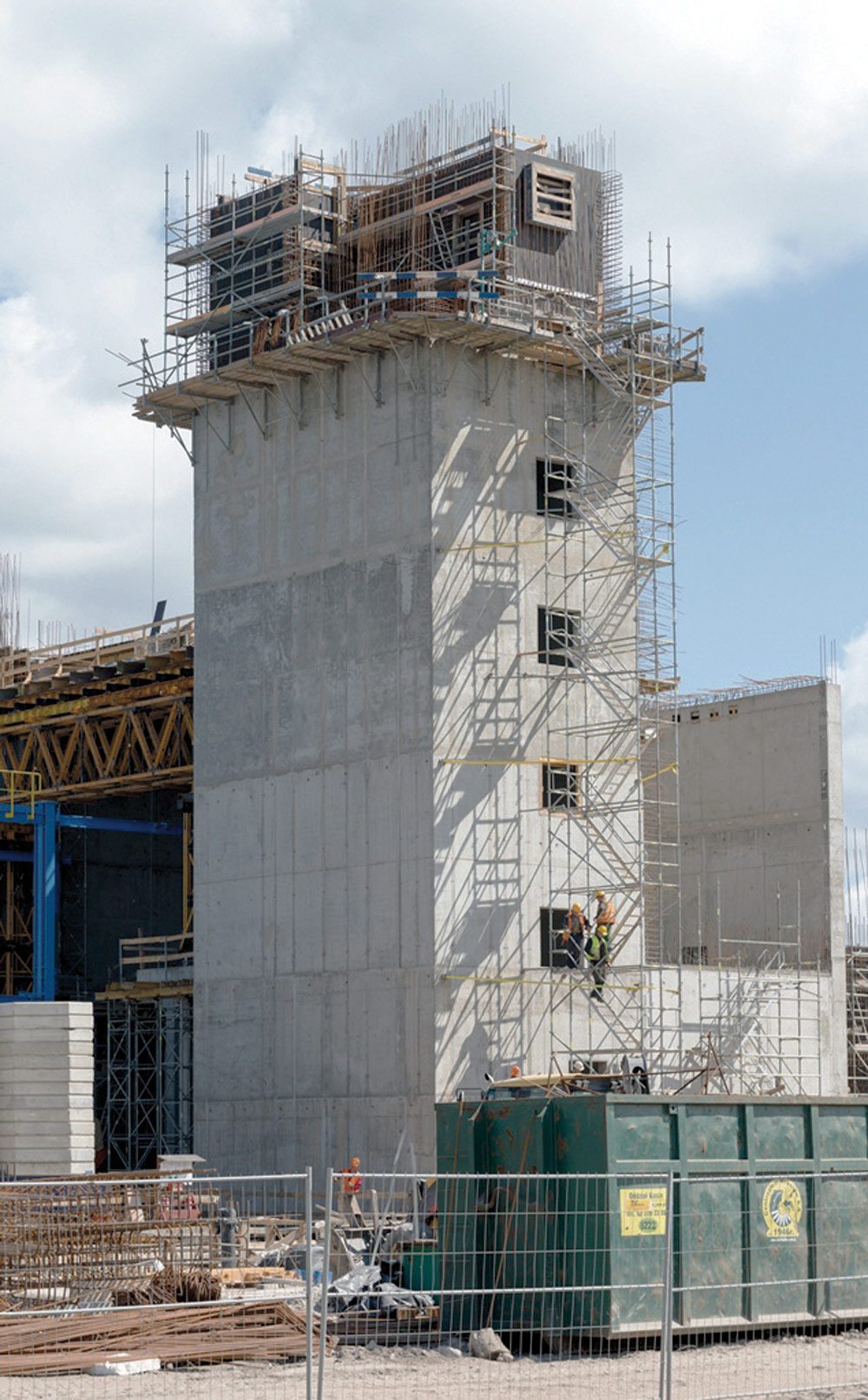 The next step was done at the bottom of the building. The 2.65 m high walls were built with SMK trusses and 2.70 m high ENKOFORM V-100 beam-based formwork panels. The tallest walls were built with BMK climbing brackets supporting 5.4 m high ORMA formwork gangs. Due to the system's efficiency regarding costs and time, it could be reused for the walls of other facilities.