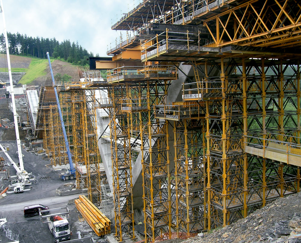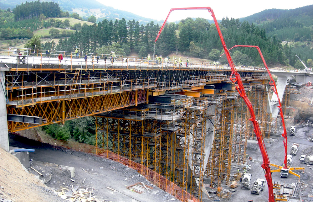 For the execution of the piers, the same products and the same process were used in all three cases: formwork with walers and beams over H-33 Trusses, sufficiently long for the concrete pouring of both stages, 35 m in length. Additionally, the HM-500 beam Formwork gangs were made with plywood, beams and walers. The entire assembly was supported on H-33 Trusses, positioned 0.5 m from each other. The gangs were joined by means of tie rods. The load transmission from the piers to the ground was done through two sets of T-500 towers. Loads were also distributed to the pier plinth through profiles with anchor bars and formwork stripping wedges.