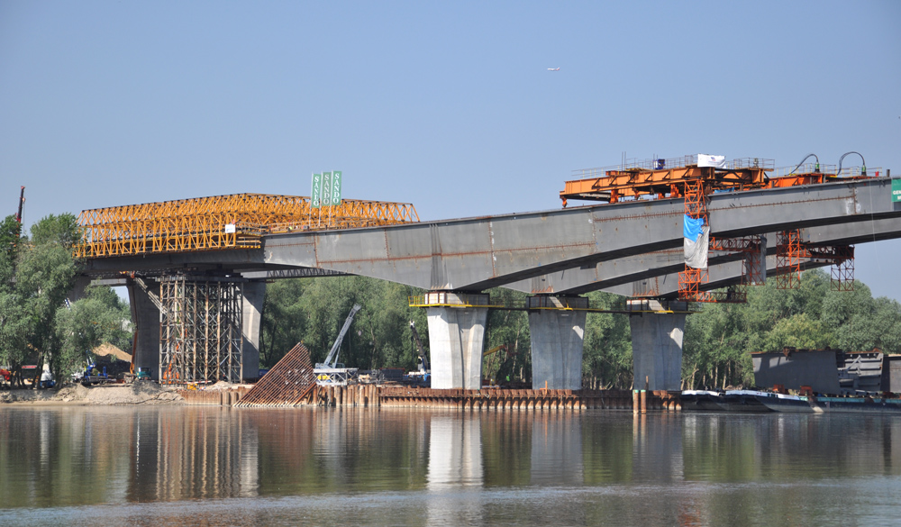 The 795 m long bridge has three separate carriageways: two of 13.36 m width for vehicular traffic and a third of 12.76 m for trams, pedestrians and bicycles. The bridge has 10 between 45 and 160 m long spans.