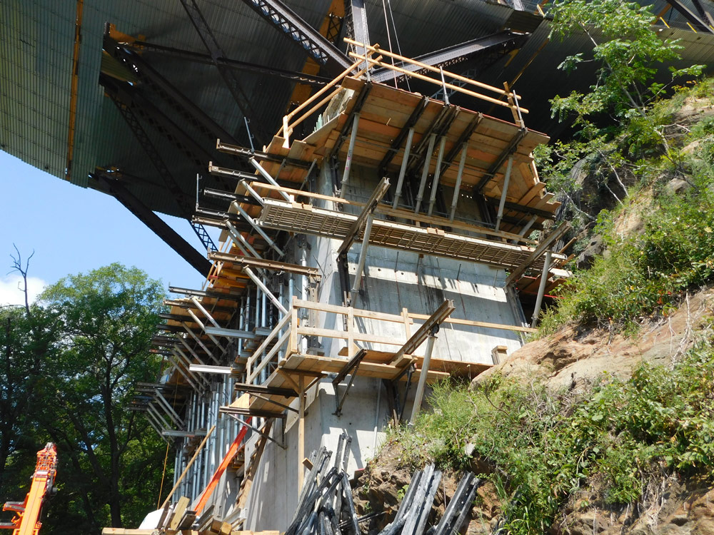 ULMA provided MEGAFORM and mini A-frames with C6 Channel for one sided multi level pours for Piers 1and 2 on this bridge. This project required one of ULMA's multiple solutions available for one-sided forming applications. We used a combination of our ALUPROP aluminum shoring system, aluminum stringers and mini A-frame system to support the MEGAFORM to rebuild the piers for this bridge. The MEGAFORM and support structure was lifted by crane successively to form these piers. ULMA's engineering department played a key role in designing the system to enable the contractor to efficiently and safely rehab the bridge piers.