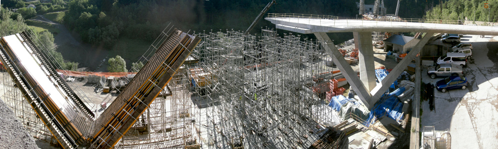 The pier at the junction of the three structures had been designed as a tripod on top of a plinth. The forks of different lengths and with 3.5 m width and a variable cross section were built using the same products as for the viaduct deck, making the most of the various construction stages. The gangs, of approximately 4 m, consisted of bottom formwork (ENKOFORM HMK), two formwork sides and one formwork panel as stopend. This solution provided a perfect concrete finish and enabled dismantling the formwork by parts. The support was made up of four DU-120 support beams and a series of shoring towers. These light supports, easy and fast to assembly, were afterwards moved by crane from one to the next pouring step. This way, the works were sped up and costs were considerably reduced.