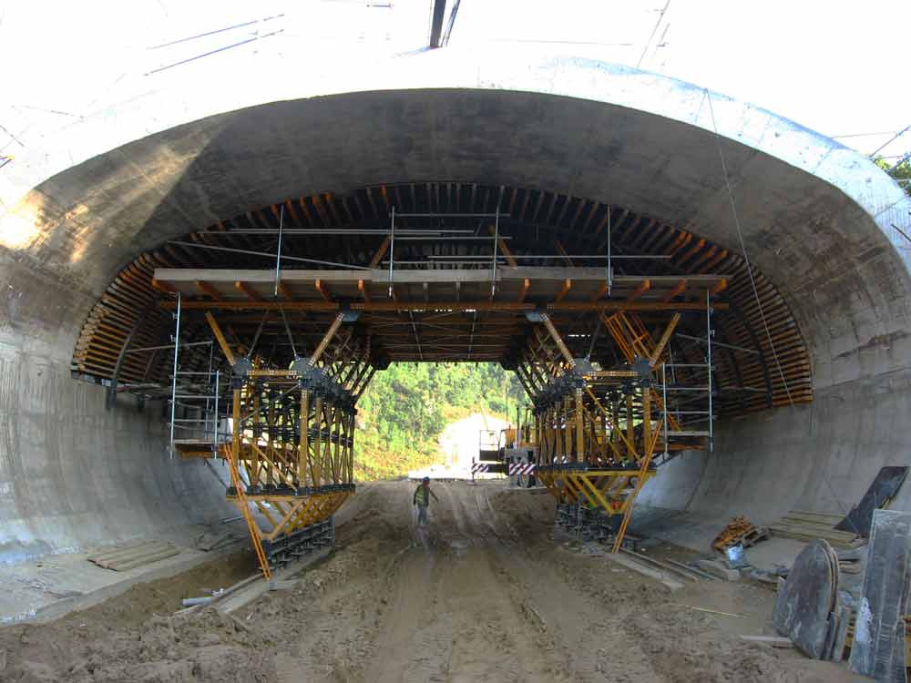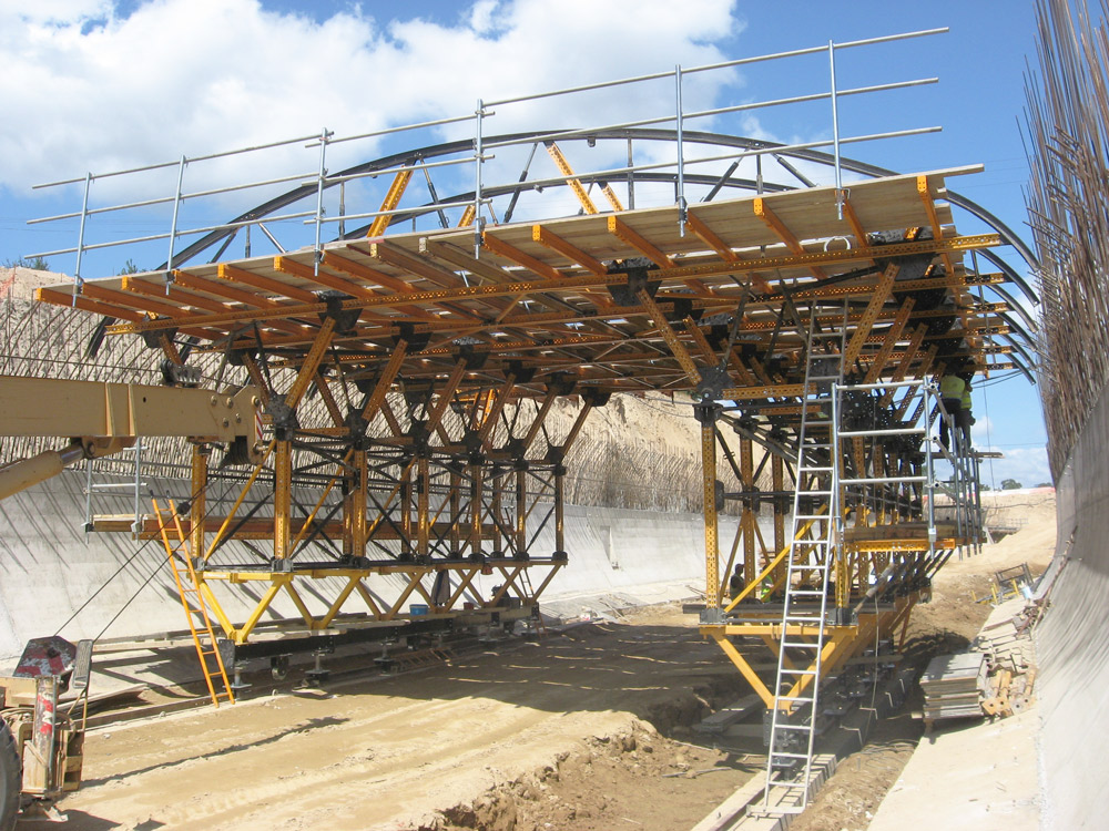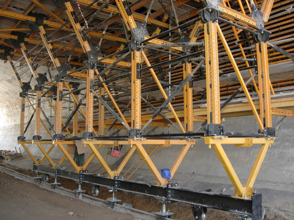 For the vault of the cut-and-cover tunnel, the inside formwork was placed on a vertical formwork carrier moving on rails. The form carrier consists in a structure of MK walers. It has working platforms at several levels with handrails of 1.5 m and safe access.