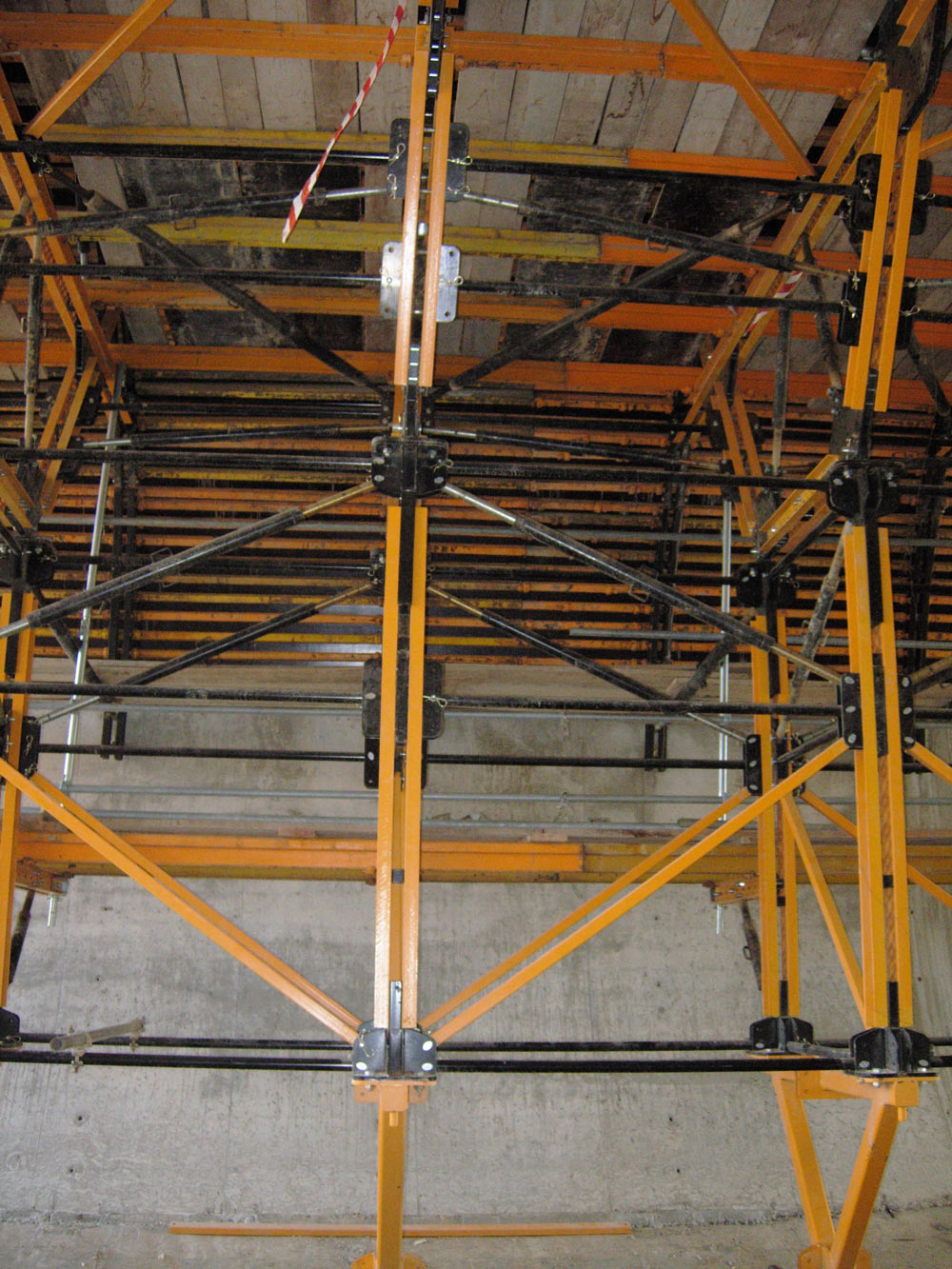 In vault areas where double-sided formwork was required, a crane-handled outside formwork joined to a working platform was used. The working platform consisted of ORMA brackets to plumb the outside formwork unit.