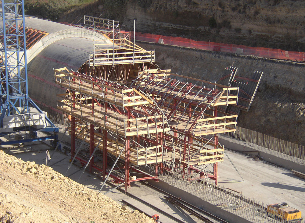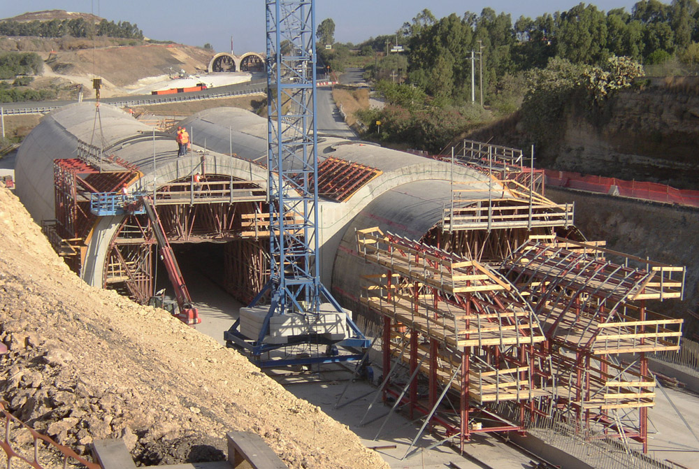 The twin-tube cut and cover tunnel is part of the construction work for the highway between Catania and Siracusa. With an approximate length of 800 m, both tunnels are 30.5 m wide, with a maximum height of 9.5 m from the foundation to the keystone and an internal diameter of 13.5 m. The construction of the two galleries was carried out simultaneously in the open air with standard MK Structures.