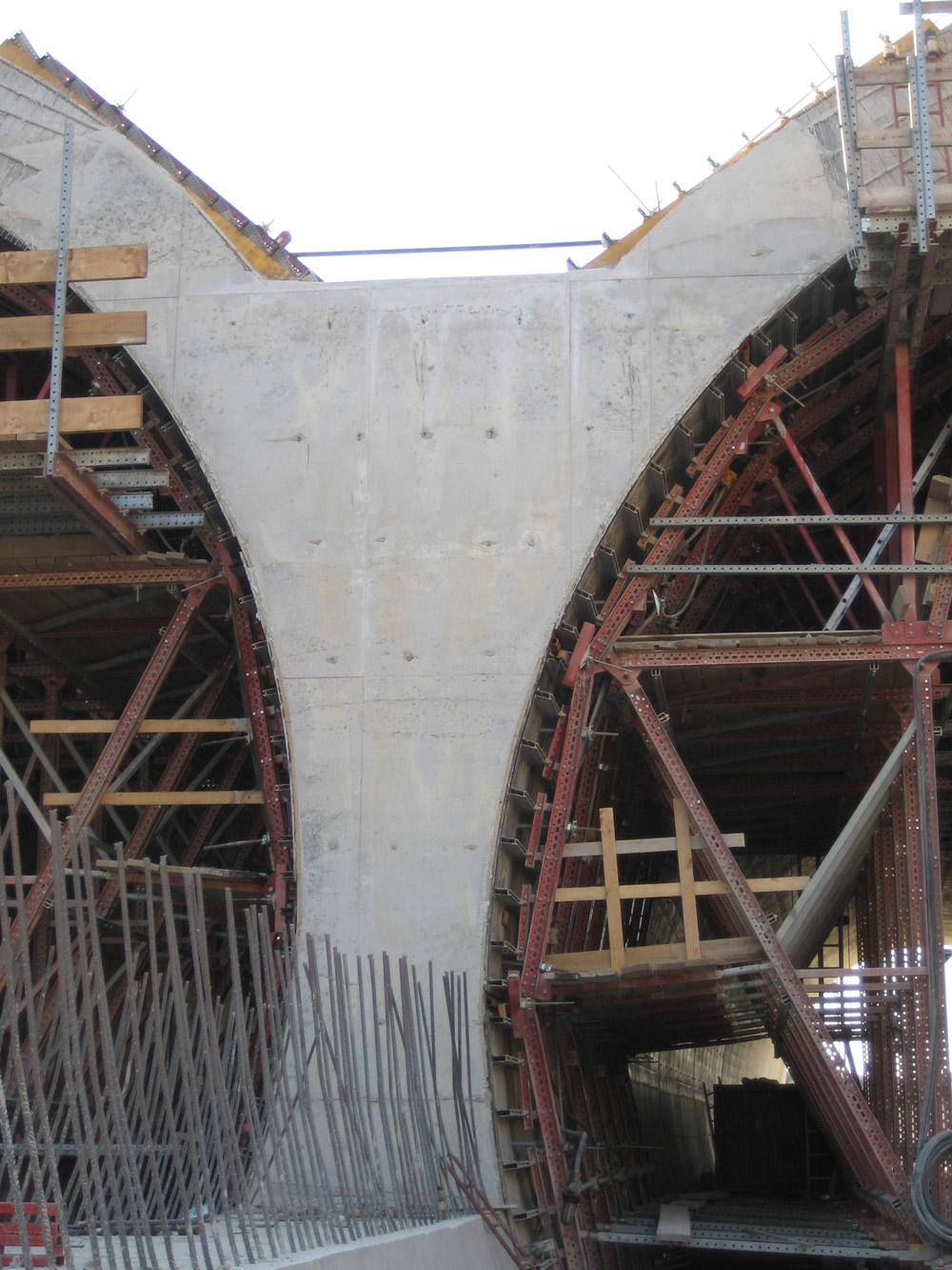 The inner formwork was equipped with a hydraulic system that enabled its movement, both vertical and horizontally. The higher performance reached in this way resulted in lower execution costs. Additionally, the formwork was equipped with an external pneumatic vibration system that gave the concrete a high quality finish and reduced pouring time.