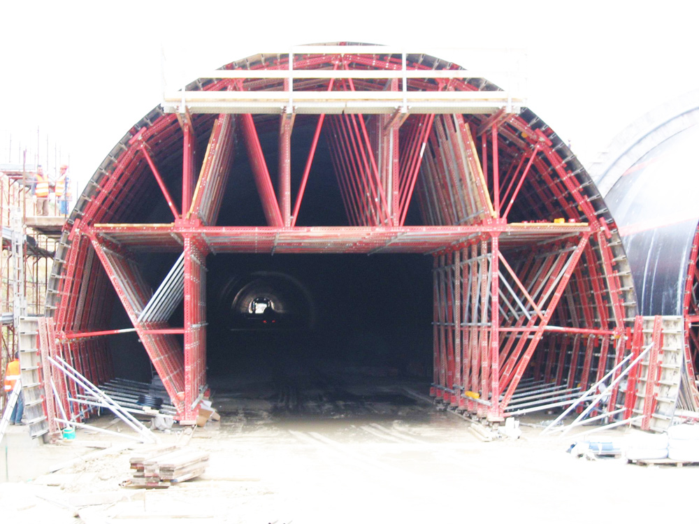 The MK system used in this project consisted of a formwork carrier trolley moving inside the tunnel. This was the way to cast complete section. The trolley moves on a rail beam thanks to a rolling system and covers 12.5 m tunnel length. The working pace was high as the panels used to cast the vault were provided pre-assembled.