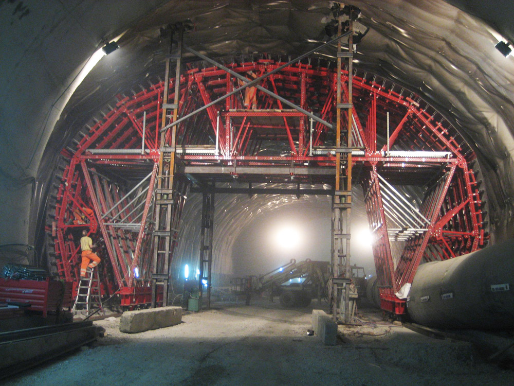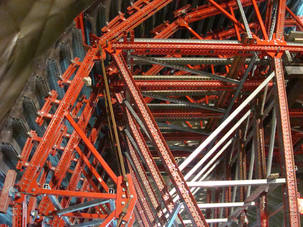 The formwork carrying trolley used to build the tunnel galleries (15.7 m wide, 6.2 m long and 9 m high) was made up of standard parts. Hydraulic jacks controlled from a central unit were in charge of putting the formwork panels in place and moving the structures inside the tunnel. This system made the task of moving the 28 t MK Structure easy. The vault formwork carried by the trolley was lifted by means of hydraulic cylinders.