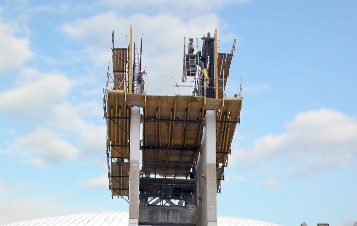 The KSP is a platform for the support of formwork and is used for elevator cores and staircase shafts, hollow piers or other types of cavities where formwork support is necessary. It is usually combined with conventional climbing brackets on the outside faces of the wall.