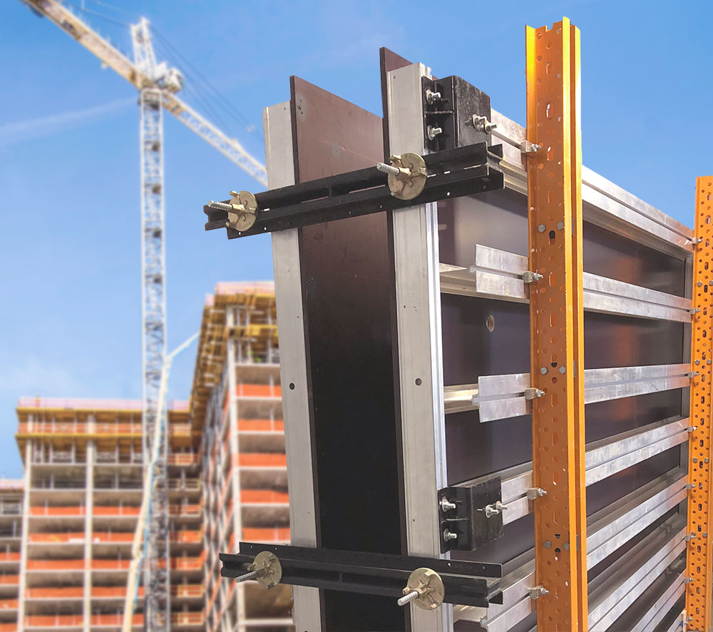 With the introduction of the MK20 aluminum profile other ULMA forming systems such as MEGALITE and MEGAFORM can easily attach to any MK20 panel using only the MEGAFORM clamp. This allows for corners, pilasters, and cores to be formed quickly without any additional walers, angles, or bolts, as necessary.