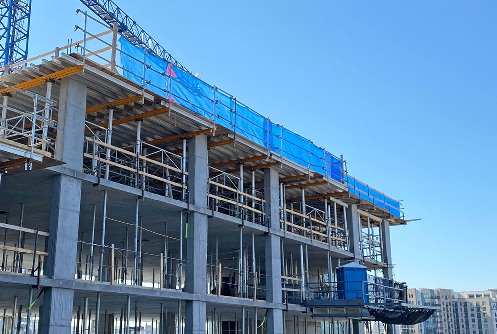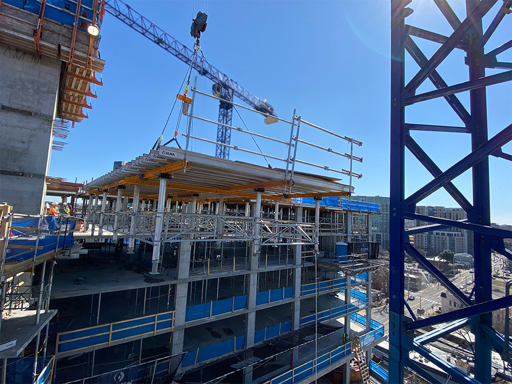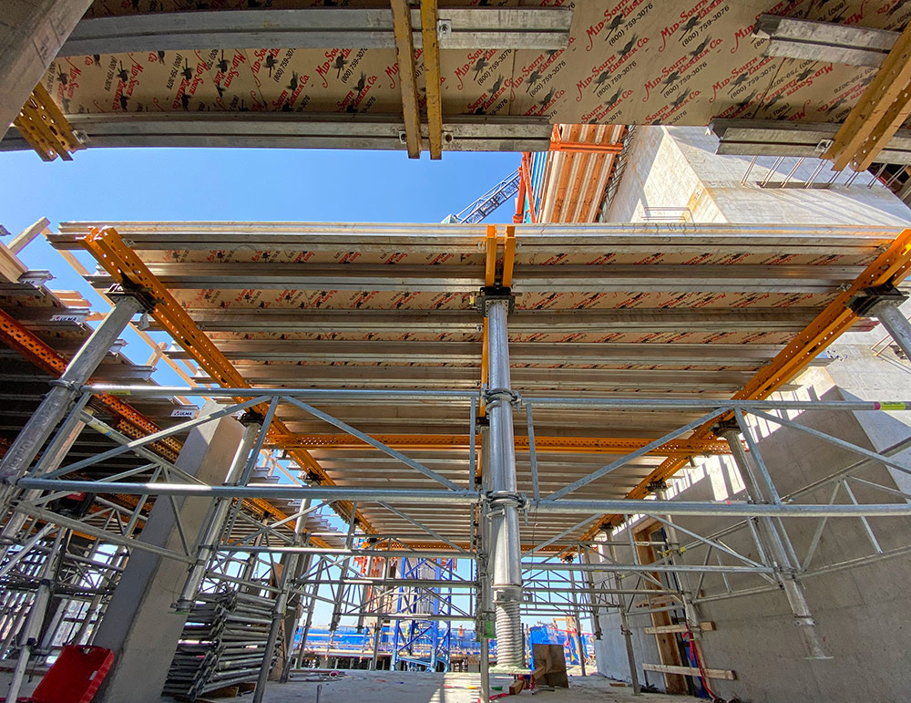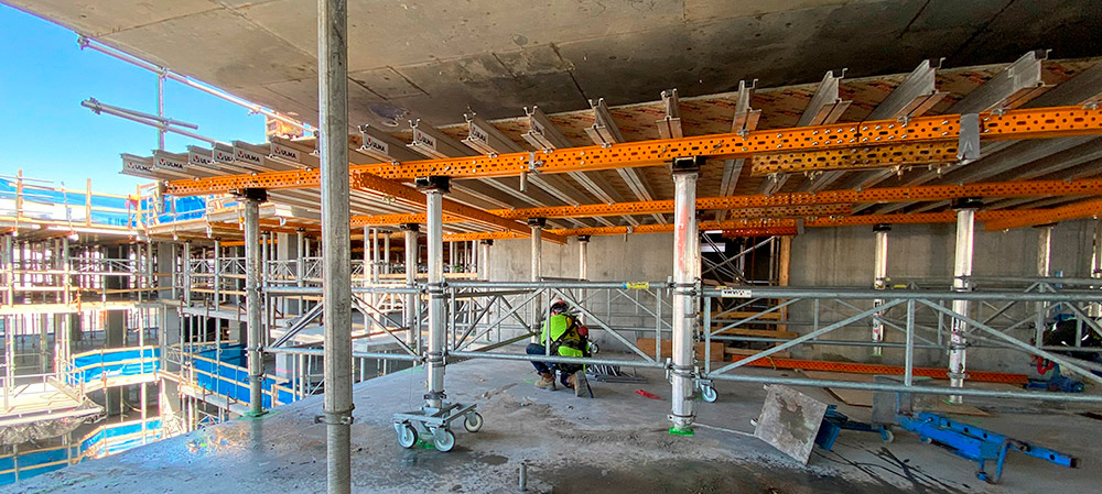 - Plywood and ALUPROP post shores are used to infill areas between tables.