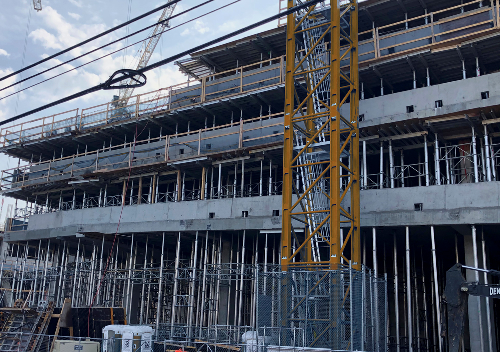 ULMA provided the climbing bracket BMK and the shaft platform KSP, both simple and versatile choices for climbing solutions. The residential building is 24 stories high with three shear walls. The shear walls were formed using MEGAFORM supported by BMK and KSP. The elevator core uses three BMK brackets spanning 28’. The KSP platforms in the stair core spanned 14’ additional BMK brackets to be added once the slab drops off at the 10th level. ULMA is providing the same solutions for the hotel as well.