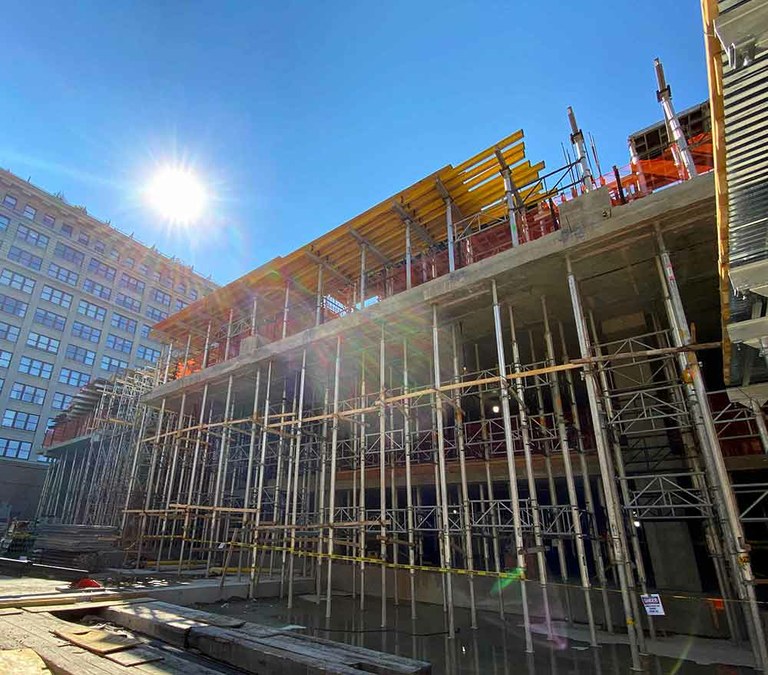 The Rail Climbing Formwork RKS system is part of the structure's climbing solutions. The RKS will be used for the elevator core of the building. It is planned to begin on the sixth floor, all the way up to the 27th floor.