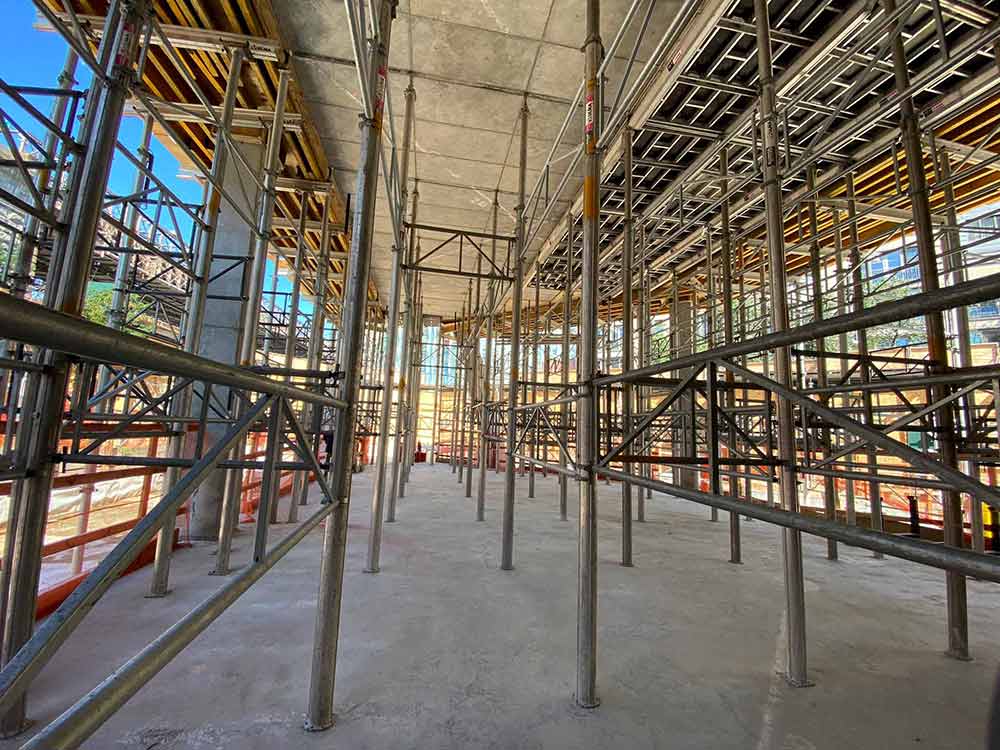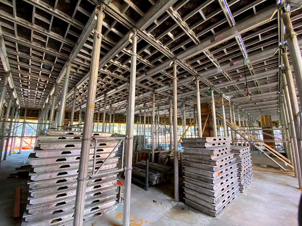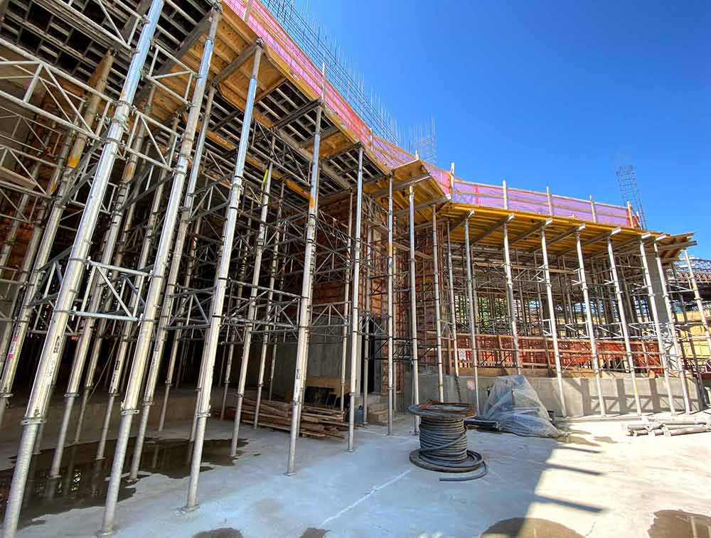 ULMA is providing formwork, shoring, and climbing solutions. The floor layout is currently being done with our Panelized Drophead Slab Formwork CC4, light and safe slab formwork with an excellent concrete finish. Some floors required special attention, i.e., the sixth floor, which has a big terrace plus a pool that was part of the shoring details. For these special requirements, ULMA offered MEGAFRAME as the shoring solution because of its high-shoring heights.