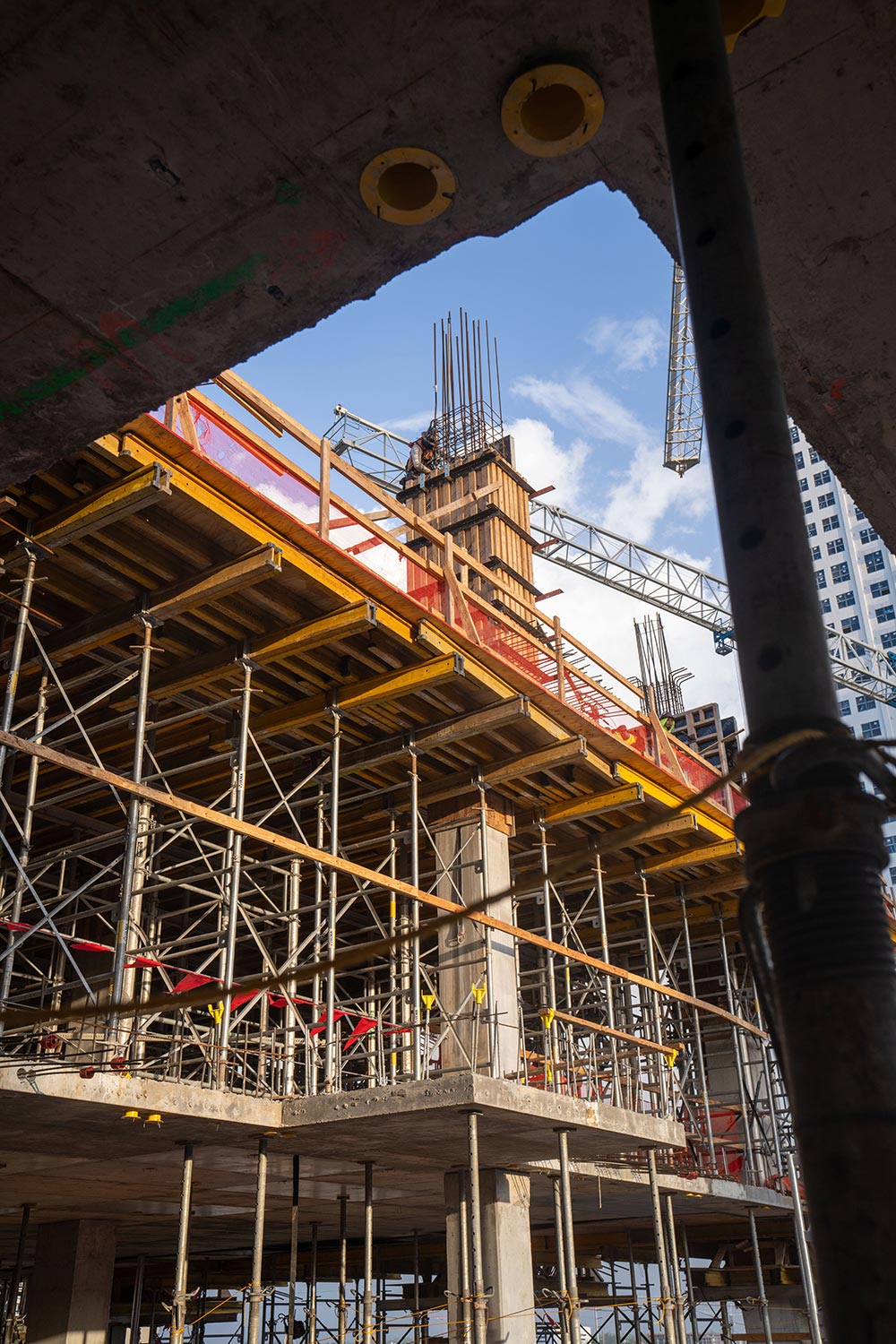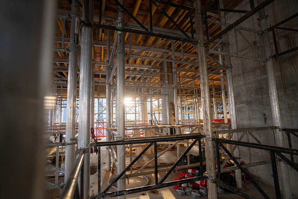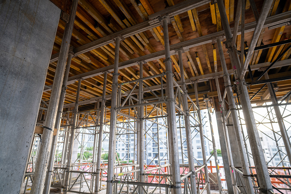 An array of different ULMA product solutions was required for multiple uses and various dimensions on this project. The GARAGE BEAM SYSTEM was used for the garage levels, which is incorporated into the residential area, that was handled using ENKOFLEX shoring. ALUPROP towers was part of 9th level, as for the pool level with some high shoring areas at Level 3. The tower using the ENKOFLEX solution included aluminum main beam and H20 wood runners, for low weight and management with ease. Levels 3 and 9 had the challenge of heavy transfer beams, which were supported by ENKOFLEX towers. An additional challenge with both buildings were several balconies and roof overhangs, which extended out 4' to 6' beyond the slab below. For these conditions, a technical solution ULMA has provided was using cantilevering MK-180 waler, for support.