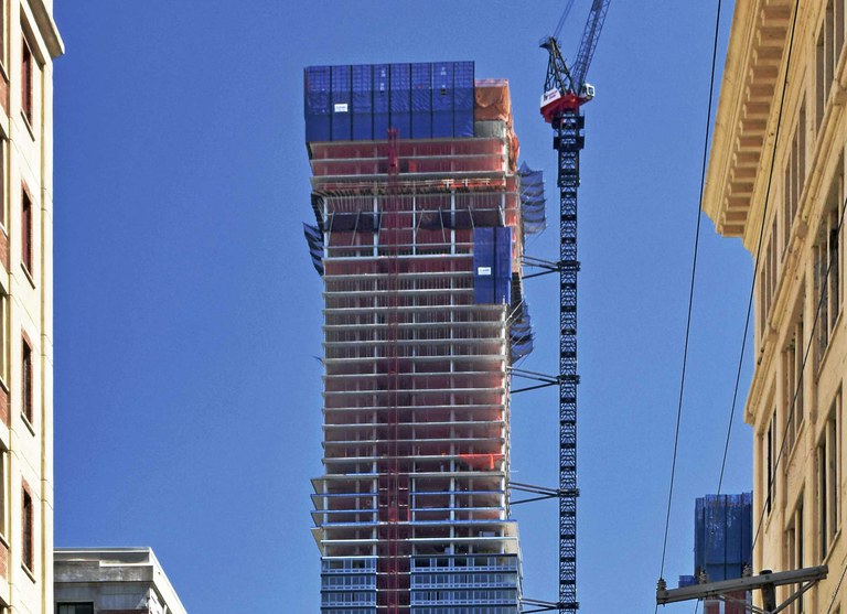 Although the geometry of the building is irregular, with floors staggered every 8 to 10 levels, the protection provided by HWS was completely seamless, preventing the fall of even the smallest of debris or other objects. To achieve the tight seal necessary for this project, strips of rubber were used around panel perimeters and between the panels and slabs. In order to take topographical references from points outside the building, such as the surrounding towers, small windows were left open in the enclosure.