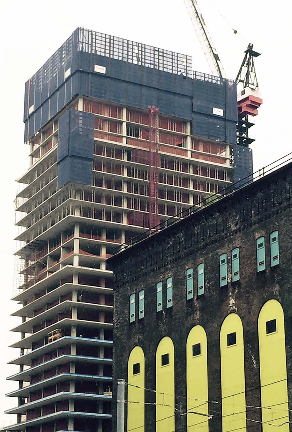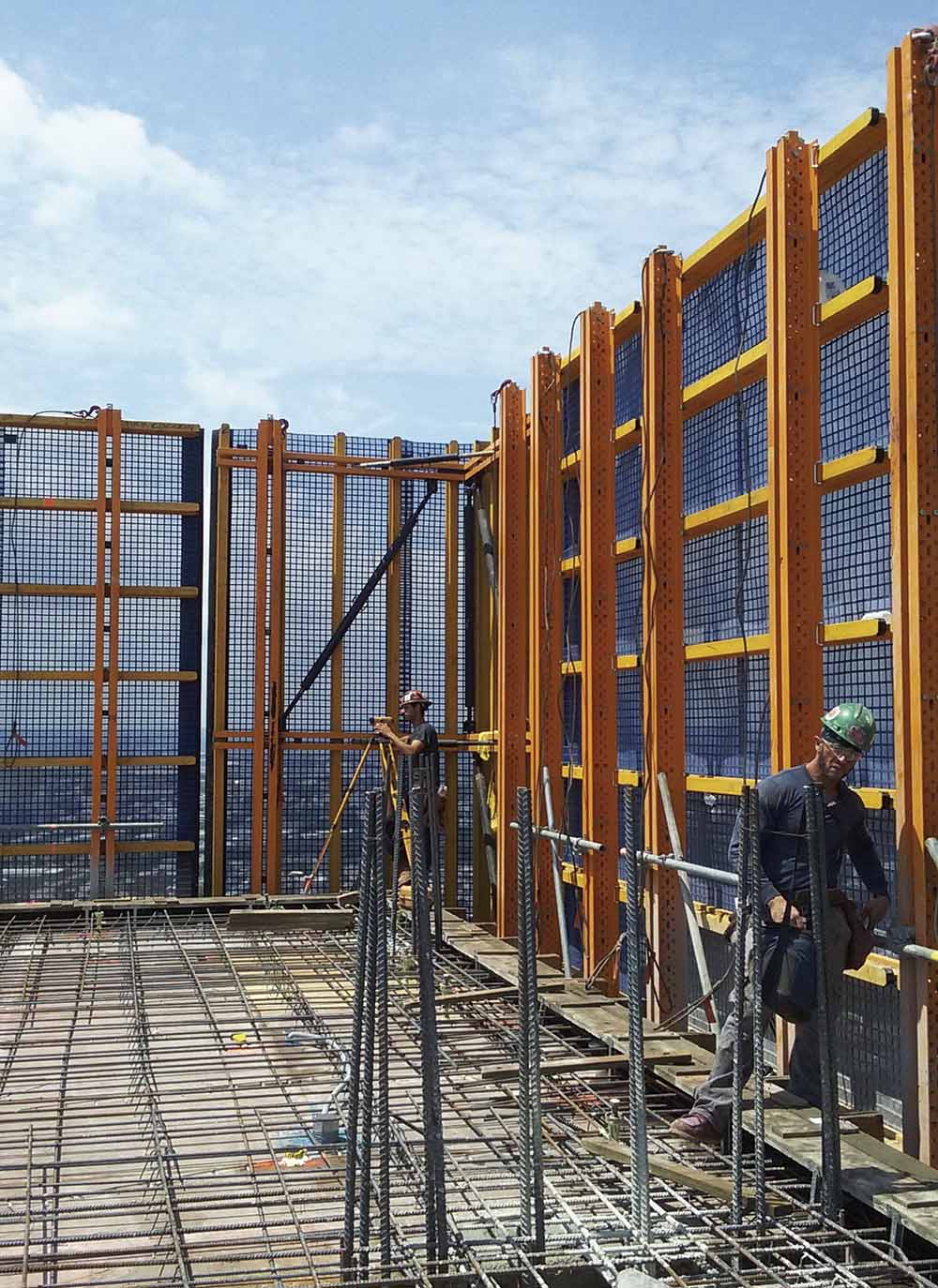 The tower perimeter was protected with HWS Screens, a safety system composed of straight lightweight panels. Movement on the worksite was thus streamlined and both people and equipment were protected from falls.