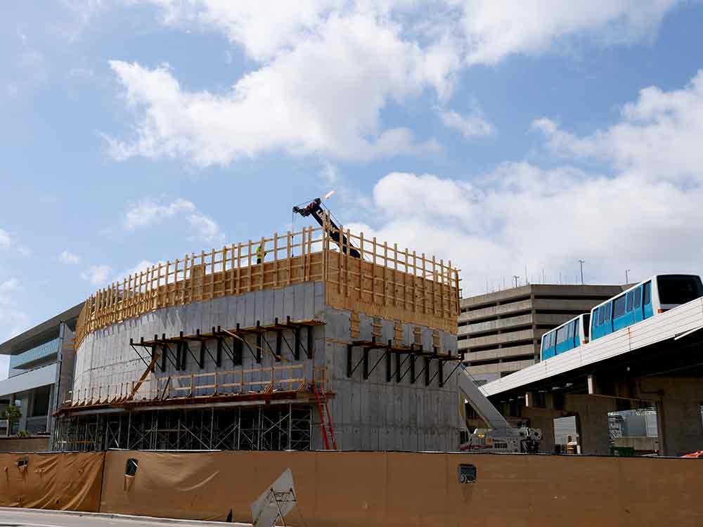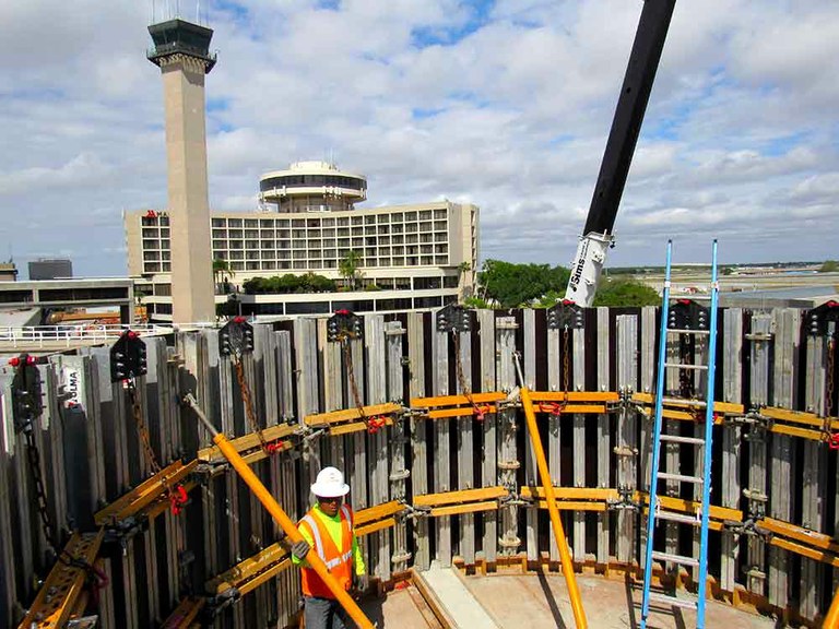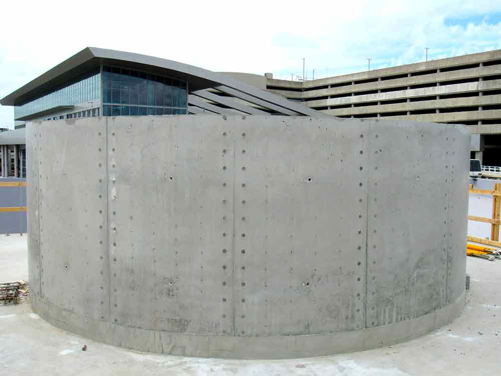 MK20 FORM CIRCULAR panels were used for the wall above the top slab in the cooling tower. 30 panels were shipped pre-assembled to the job site- 15 panels for the inner side of the tank and 15 for the external. Only one tank was put together and then was used twice to build two more tanks. The total sq ft. of one tank for this job was approximately 870 sq ft with a wall thickness of 6” and an internal diameter of 18’-2”. Tampa International Airport Cooling Tower was the first job site in Florida that used ULMA’s MK20 FORM CIRCULAR system, and so far, it has been a success!