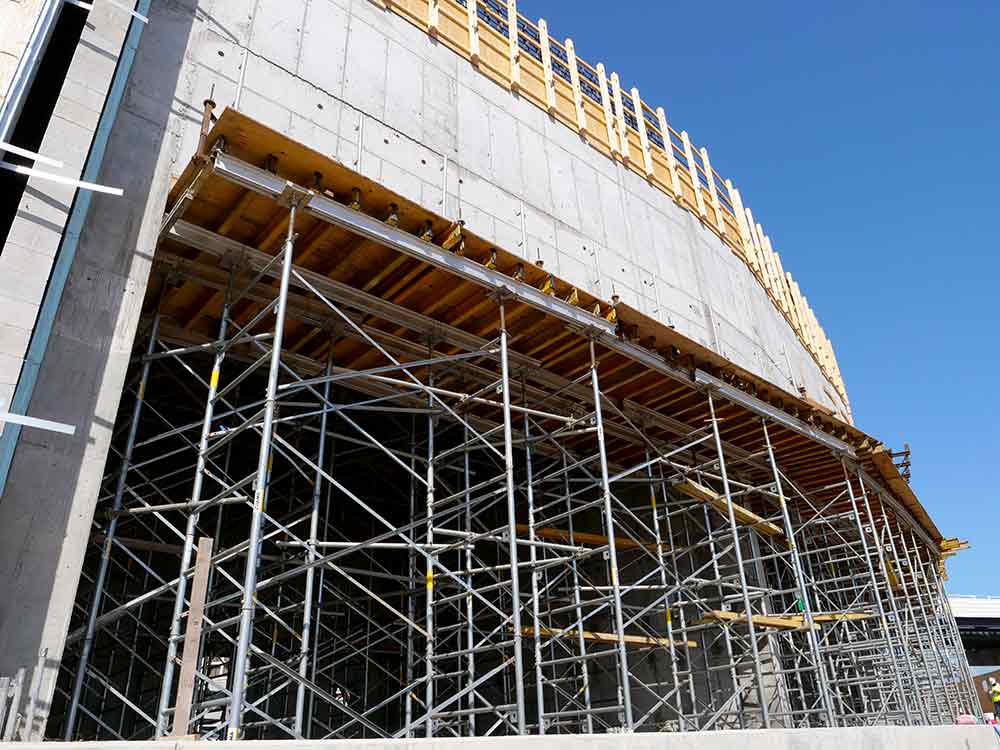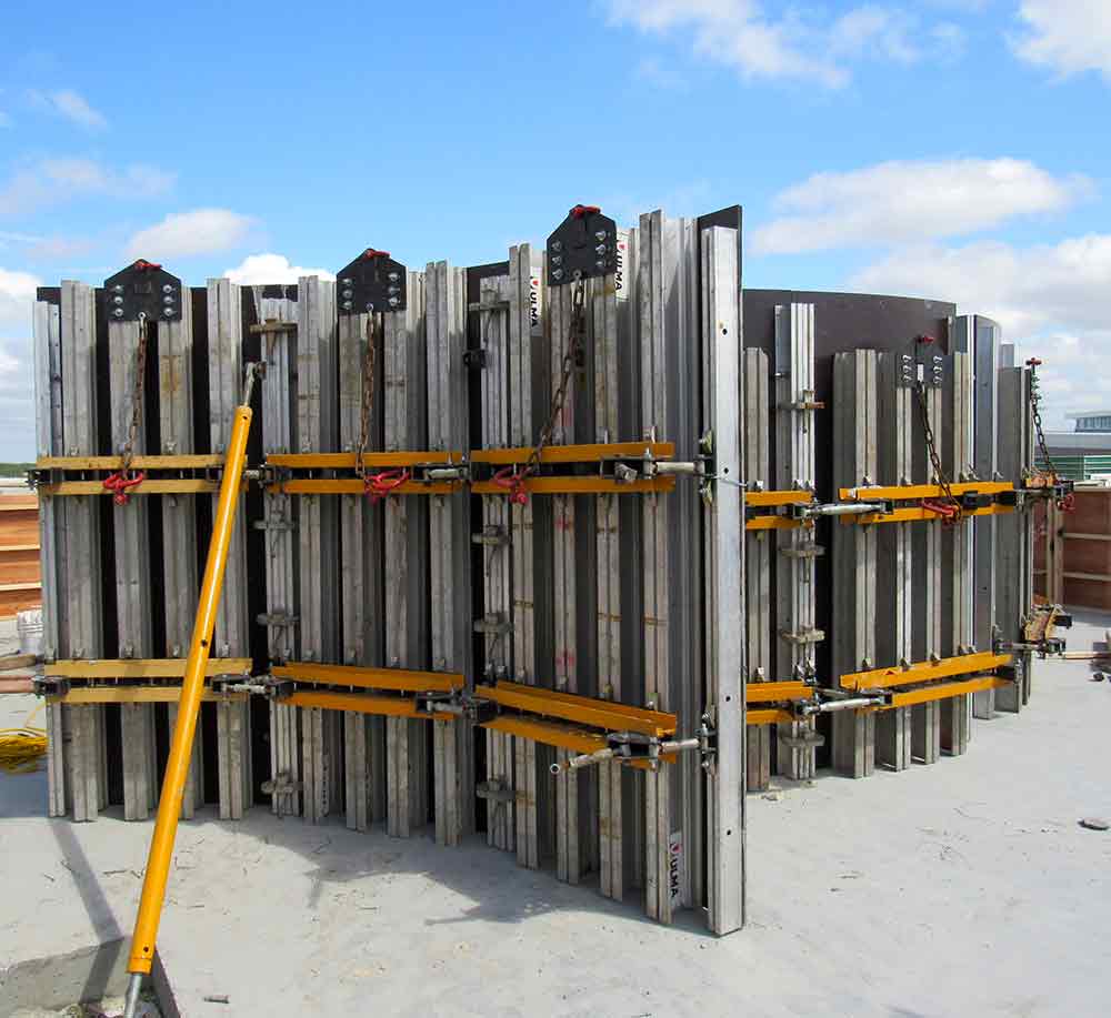 MEGAFRAME shoring system was used for the high-shoring heights, and ALUPROP shoring posts were provided for the top slab. Our Simple Climbing Bracket was installed in the outside walls allowing the workers to assemble inside and outside walls. These walls have almost 40’ total under the top slab that was done in 4 pourings.