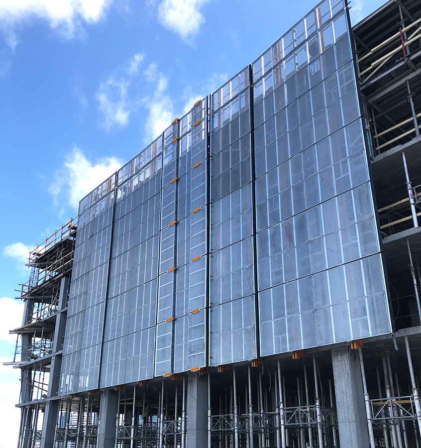 - HWS Perimeter Safety Screens- The optimized version of the safety screens provides excellent protection for workers against harsh weather and prevents them and objects from falling from the edge of the slab. The screens also protect pedestrians from falling debris. The panels cover the floor under construction and three stories below. The range of panels includes telescopic perforated steel panels, standard HWS panels, and corner panels. The screens adapt to irregular slab geometries and are hydraulically operated- without crane assistance.