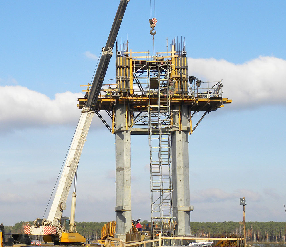 Highly flexible crane-lifted climbing system, adaptable to inclined and curved walls. Minimum transport volume.