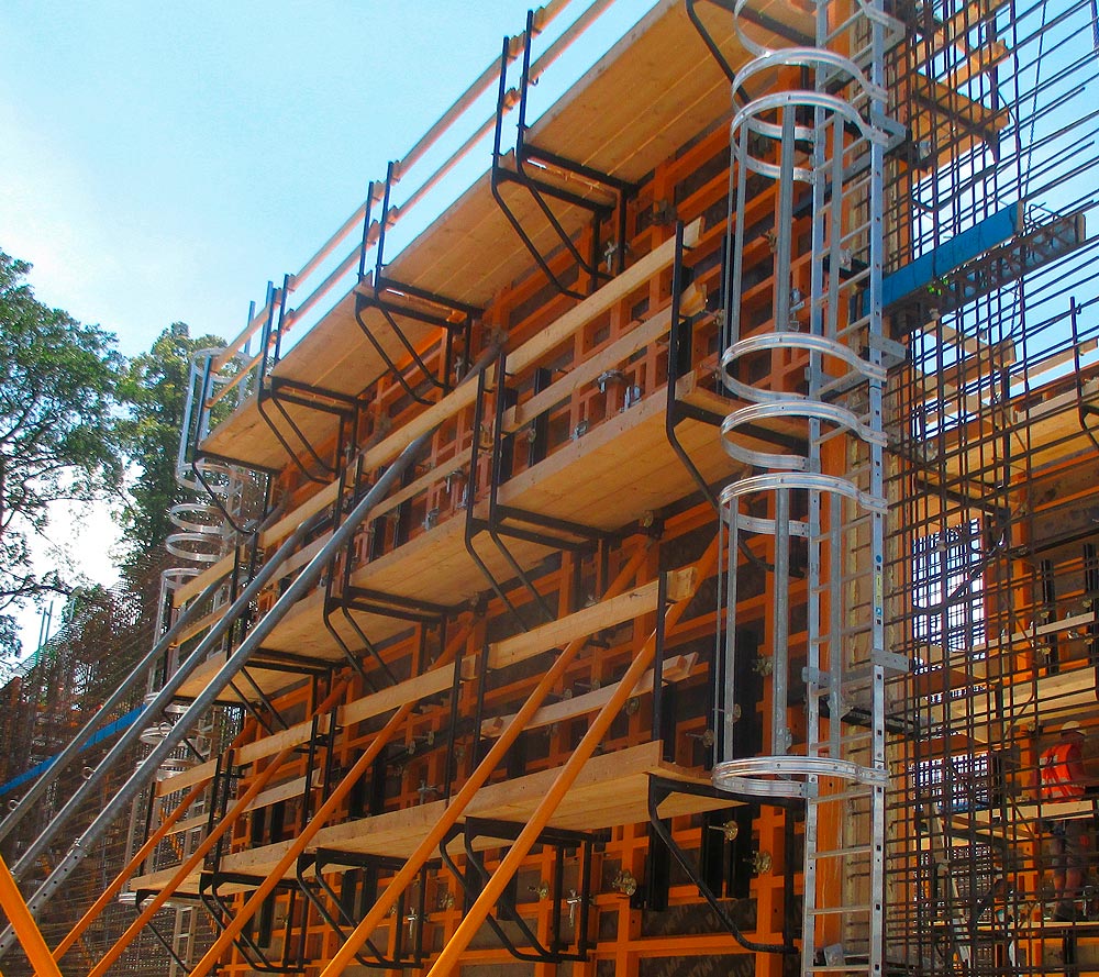 Universal safety ladder designed to ensure safe climbing up and down from and access to working platforms. Assembly is quick and easy, and is done with the panels on the ground, maintaining maximum safety from the start. The system is compatible with any ULMA wall formwork system.