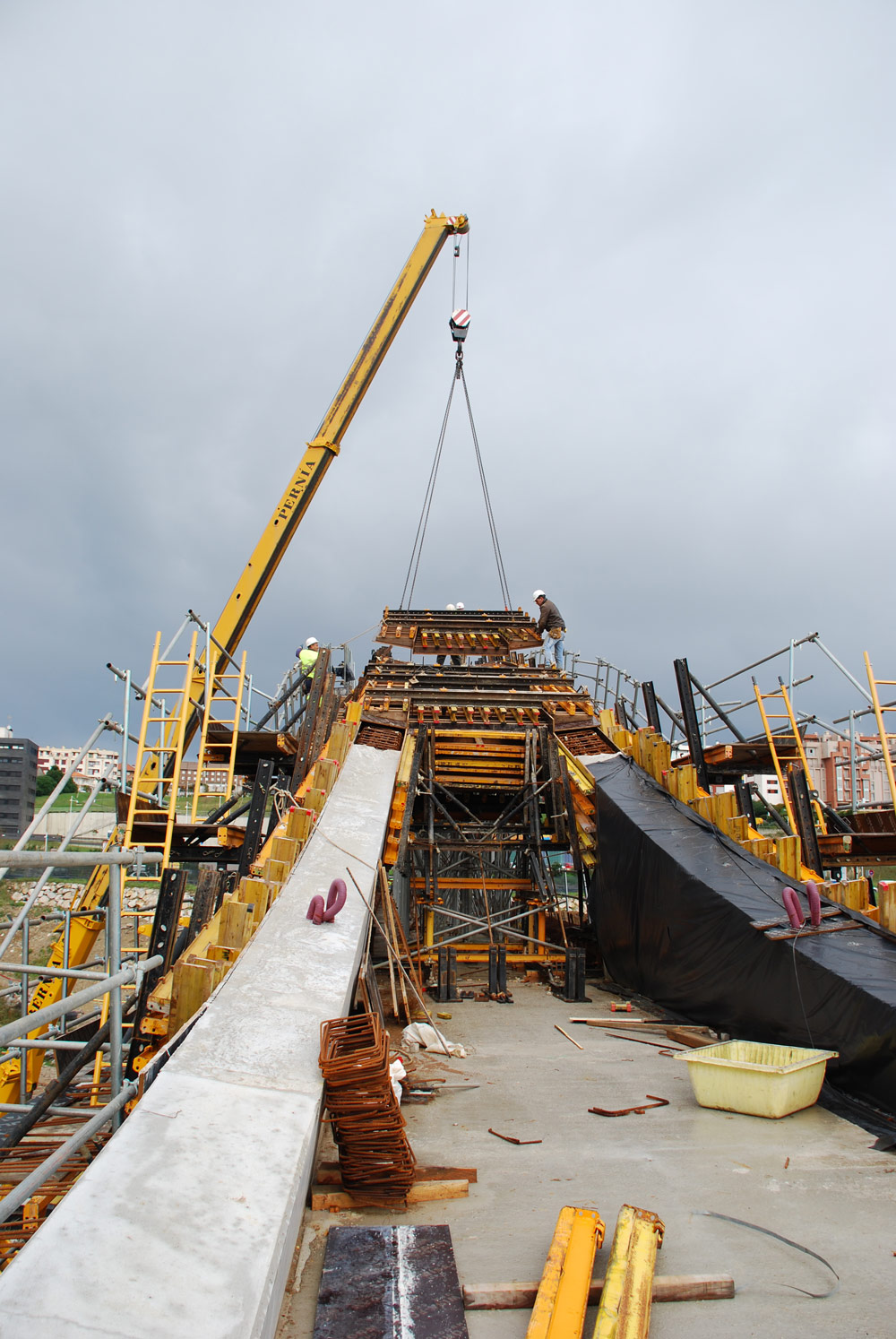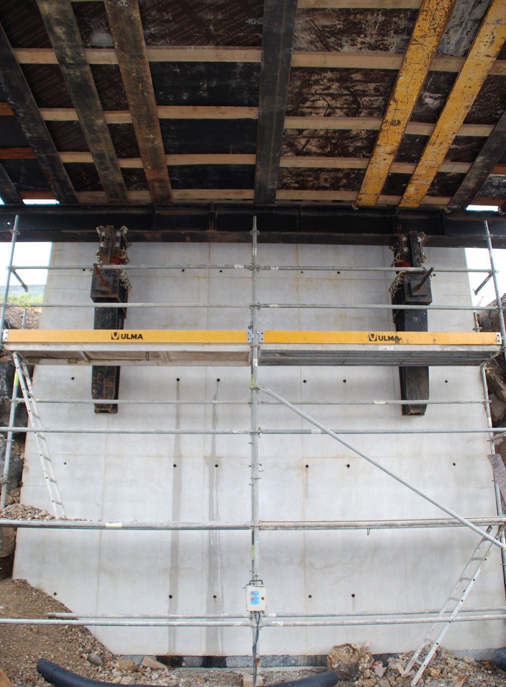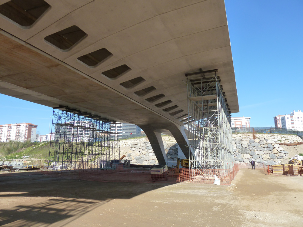 The lighter areas were shored on OC and the heavier on T-500 Shoring. At the abutments, the formwork was supported on Gantry Brackets MT. The abutments themselves were built with ORMA vertical formwork.