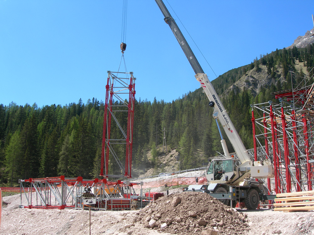 After concrete hardening and falsework removal, the same material was used in a symmetrical manner between the abutment and the pier on the other side of the bridge. A high capacity shoring tower on a temporary footing supported the central part of the bridge (40 m). The distance between bearings was spanned with high load capacity trusses carrying the formwork.