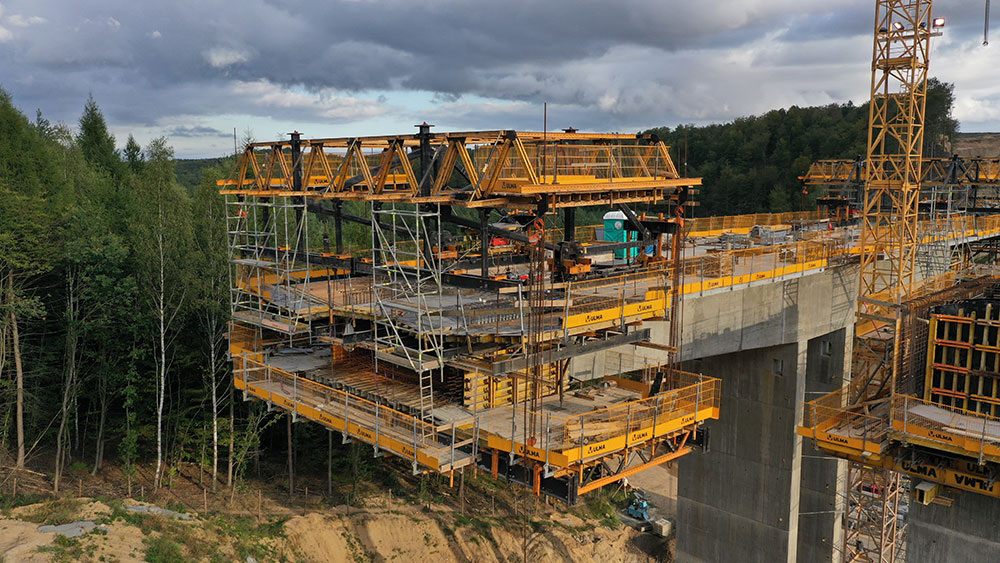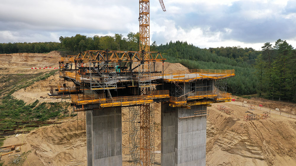 The pier segments reaching 11 m in length were poured on piers measuring 22.6 m and 20 m in height, respectively. In order to do so, a grid-work of DIPE450 and IPN500 steel beams were supported by the piers so that tall shoring systems were unnecessary. HMK Bridge Deck Formwork was used for the base and sides of the box-girder deck, due to its ability to adapt to varied geometry.