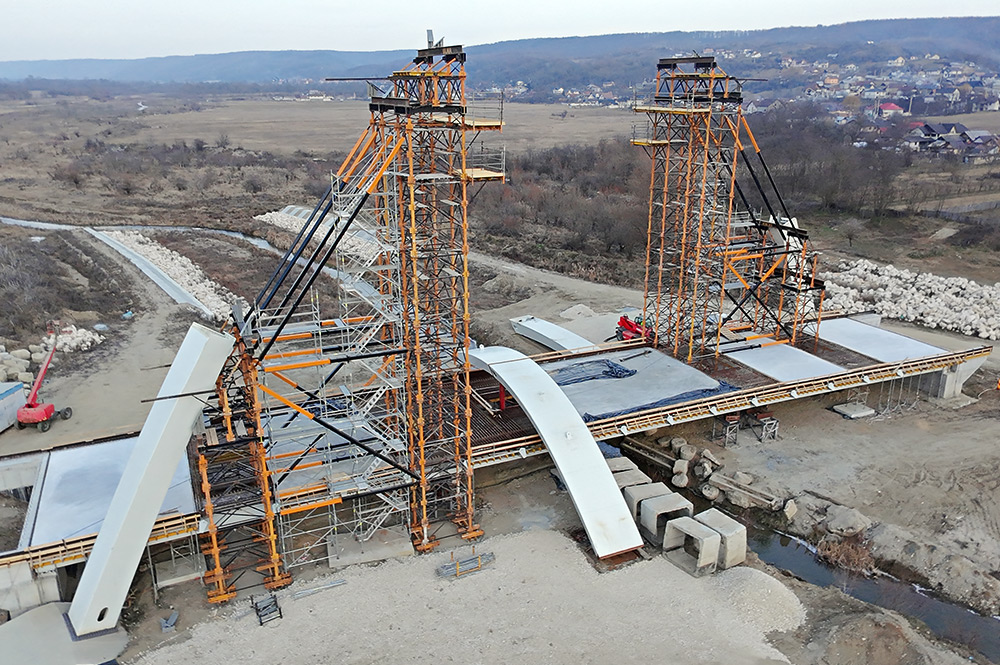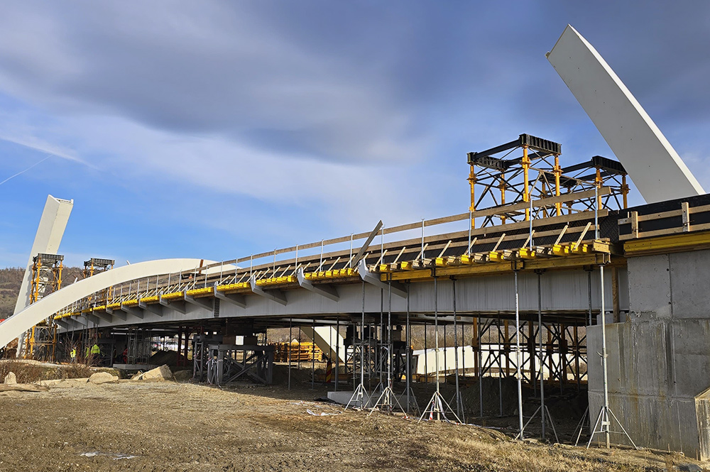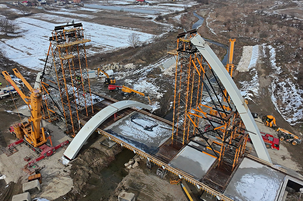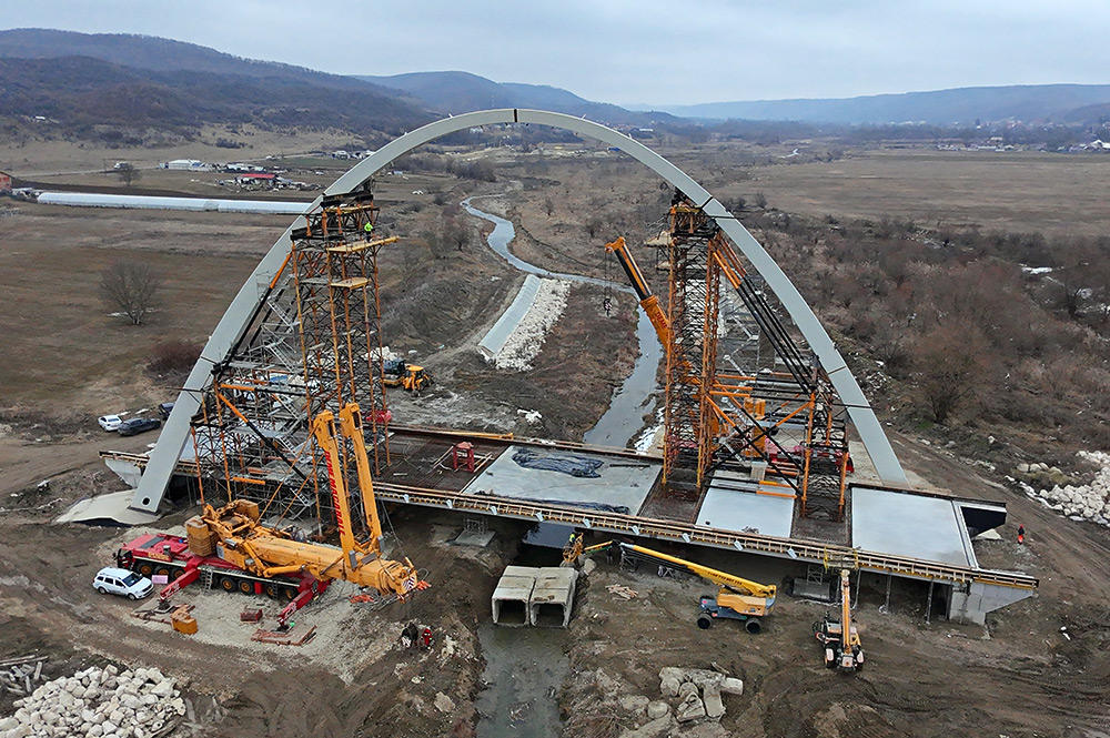 The new construction stands out through a national technical first: it is the bridge with the largest parabolic arch in Romania, spanning the deck diagonally, with asymmetrical support cables and a combined steel-concrete deck. The bridge has a span of 73 meters, is 35.50 meters high and 81.20 meters long in total, and has a width of 13 meters, including two traffic lanes and pedestrian sidewalks on both sides.