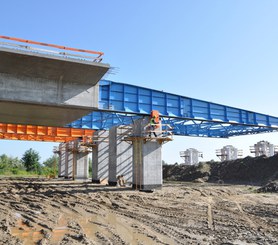 The characteristics of the design required the use of two construction systems: the conventional with T-60 and the incremental launching method. This was the first time that a bridge with a deck of two inner cross-sectional hollows has been constructed in Poland. The proposed solution made it possible to build stretches of 30 m a week, so that the construction time for each segment was reduced by 50 %.