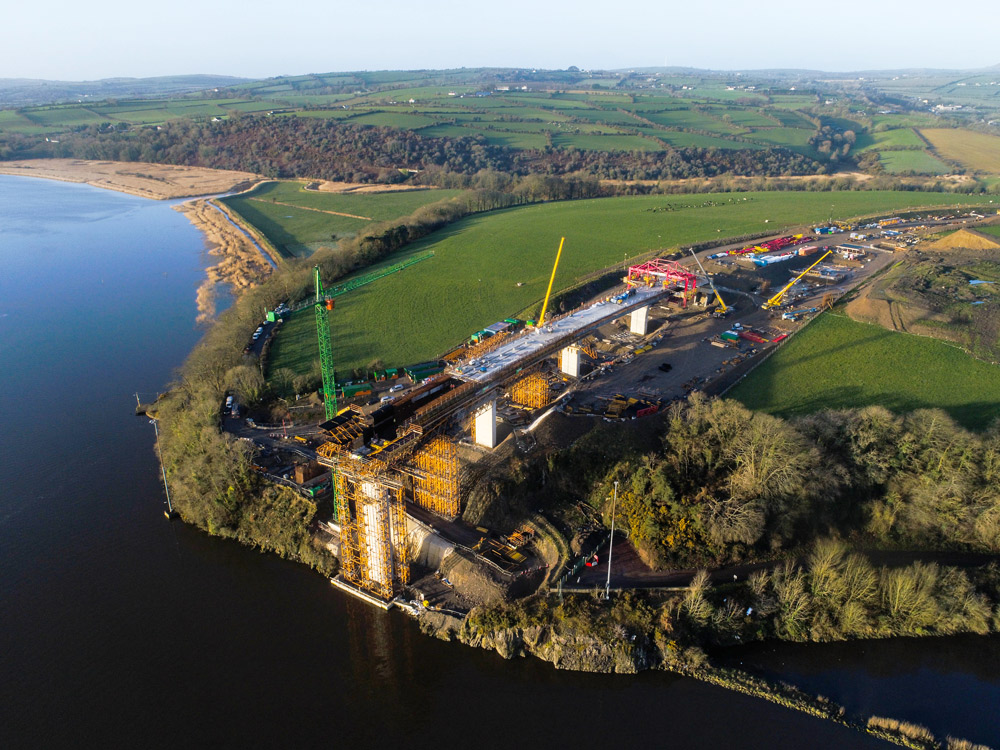 The bridge over the Barrow River, is an extradosed structure 887 m in length, making it the longest bridge of its kind in the world. This type of bridge is characterised by its cables set at lower angles, meaning that pylons are shorter in relation to deck span lengths.